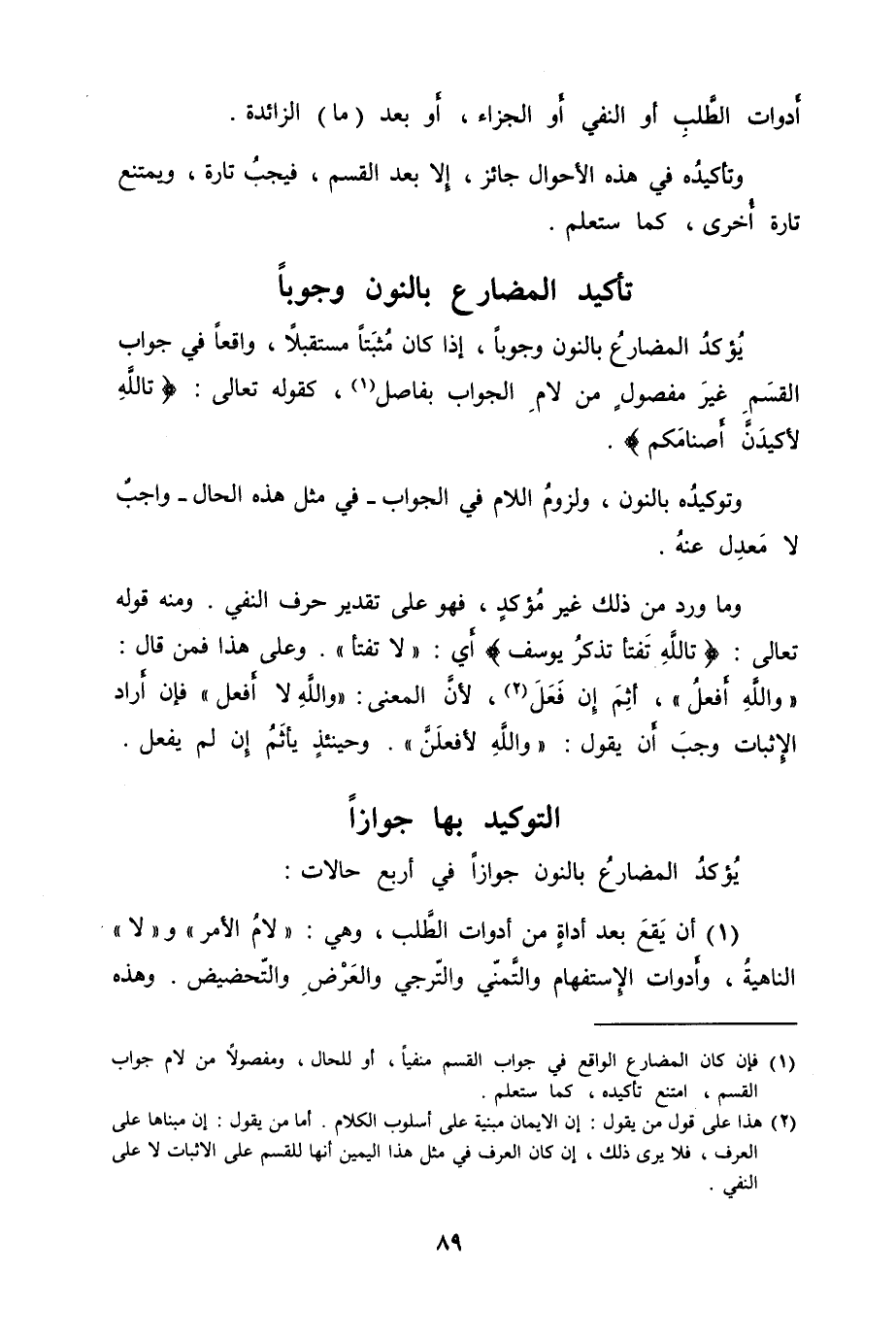 يُؤكدُ المضارعُ بالنون وجوباً، إذا كان مُثبَتاً مستقبلا، واقعاً في جواب القسَمِ غيرَ مفصولٍ من لامِ الجواب بفاصل، كقوله تعالى {تاللهِ لأكيدَنَّ أَصنامَكم} .
