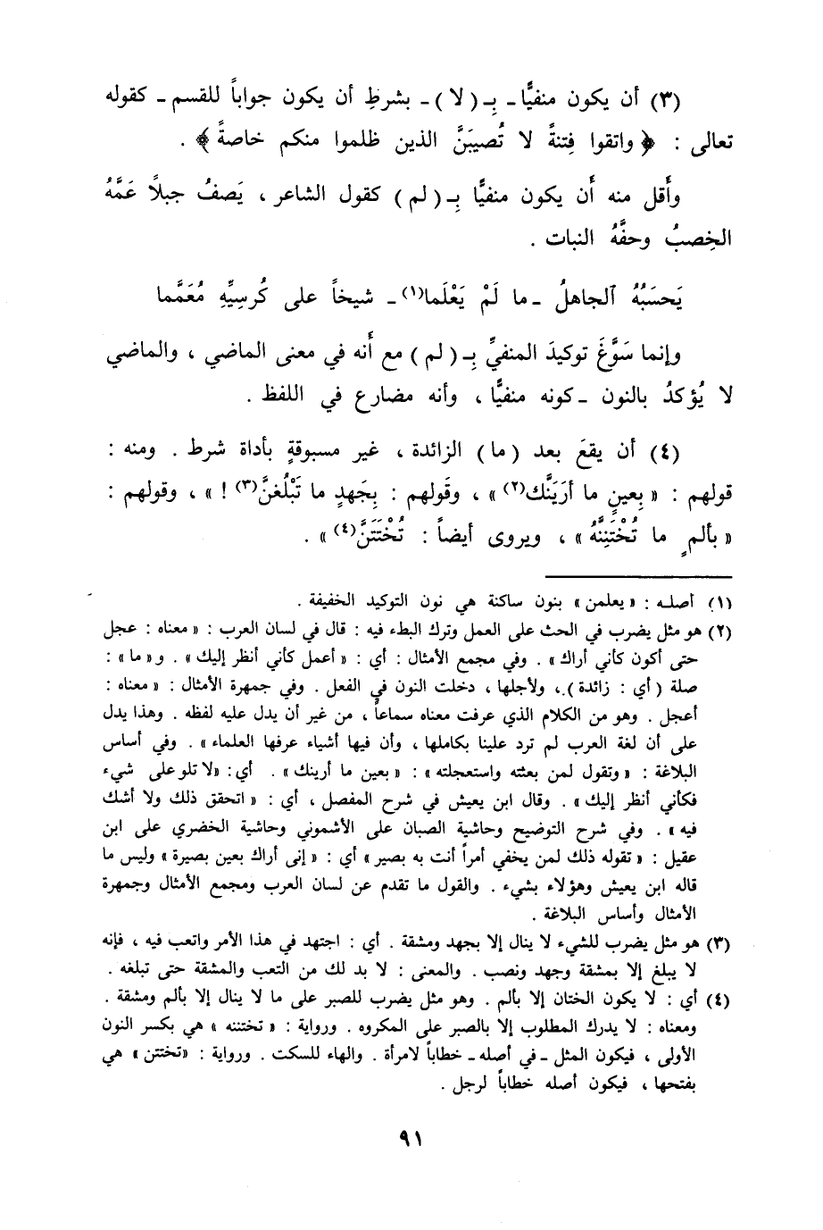 (3) أن يكون منفيًّا - بِـ (لا) - بشرطِ أن يكون جواباً للقسم - كقوله تعالى {واتقوا فِتنةً لا تُصيبَنَّ الذين ظلموا منكم خاصةً} .
