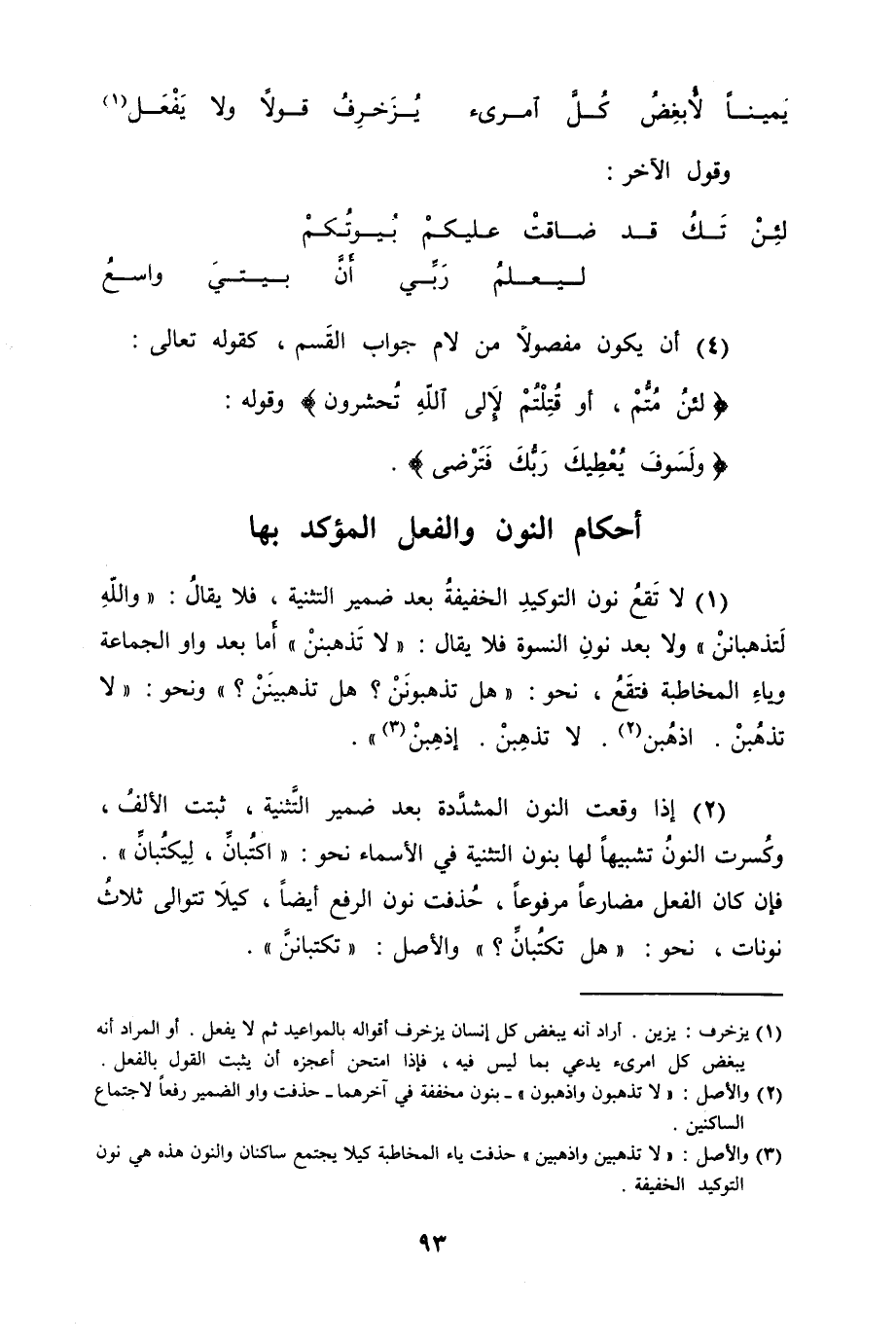 (1) لا تَقعُ نون التوكيدِ الخفيفةُ بعد ضمير التَّثنية، فلا يقالُ "واللهِ لَتذهباننْ" ولا بعد نونِ النسوة فلا يقال "لا تَذهبننْ" أَما بعد واو الجماعة وياءِ المخاطبة فتقَعُ، نحو "هل تذهبونَنْ؟ هل تذهبيَننْ؟ " ونحو "لا تذهبُنْ. اذهبُن. لا تذهِبنْ. إذهِبنْ.