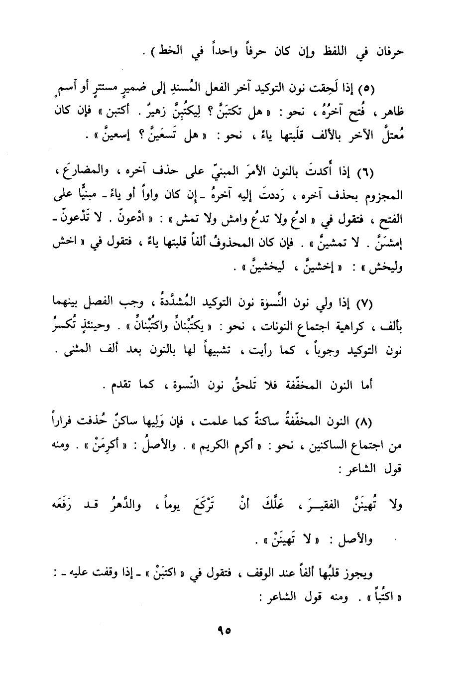 (6) إذا أَكدتَ بالنون الأمرَ المبنيّ على حذف آخره، والمضارعَ، المجزوم نحذف آخره، رَددتَ إليه آخرهُ - إن كان واواً أَو ياءً - مبنيًّا على الفتح، فتقول في "ادعُ ولا تدعُ وامشِ ولا تمش" "ادْعونّ. لا تَدْعُونّ - إمشيَنَّ. لا تمشينَّ". فإن كان المحذوفُ ألفاً قلبتها ياءً، فتقول في "اخش وليخش" "إخشينَّ، ليخشينَّ".