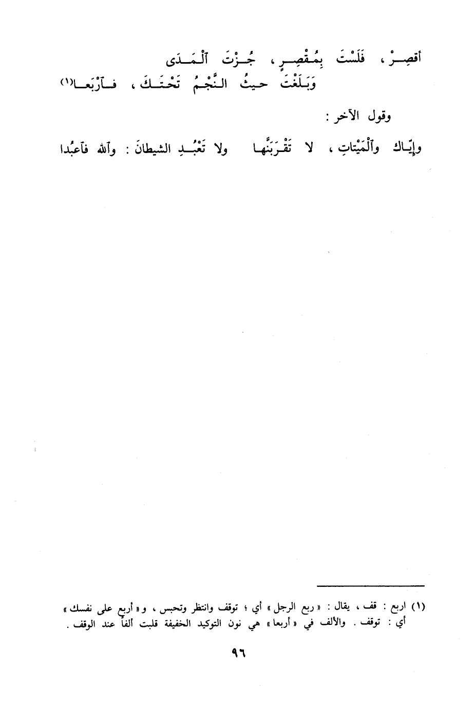 أقصِرْ، فَلَسْتَ بَمُقْصِرٍ، جُزْتَ الْمَدَى ... وَبْلَغتَ حيثُ النَّجْمُ تَحْتَكَ، فارْبَعا