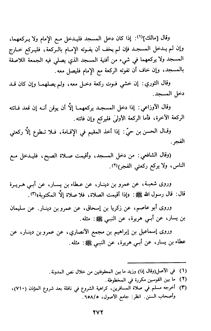 وَقَالَ مَالك إِذا كَانَ دخل الْمَسْجِد فَلْيدْخلْ مَعَ الإِمَام وَلَا يركعهما وَإِن لم يدْخل الْمَسْجِد فَإِن لم يخف أَن يفوتهُ الإِمَام بالركعة فليركع خَارج الْمَسْجِد وَلَا يركعهما فِي شَيْء من أفنية الْمَسْجِد الَّذِي يُصَلِّي فِيهِ الْجُمُعَة اللاصقة بِالْمَسْجِدِ وَإِن خَافَ أَن تفوته الرَّكْعَة مَعَ الإِمَام فَليصل مَعَه
