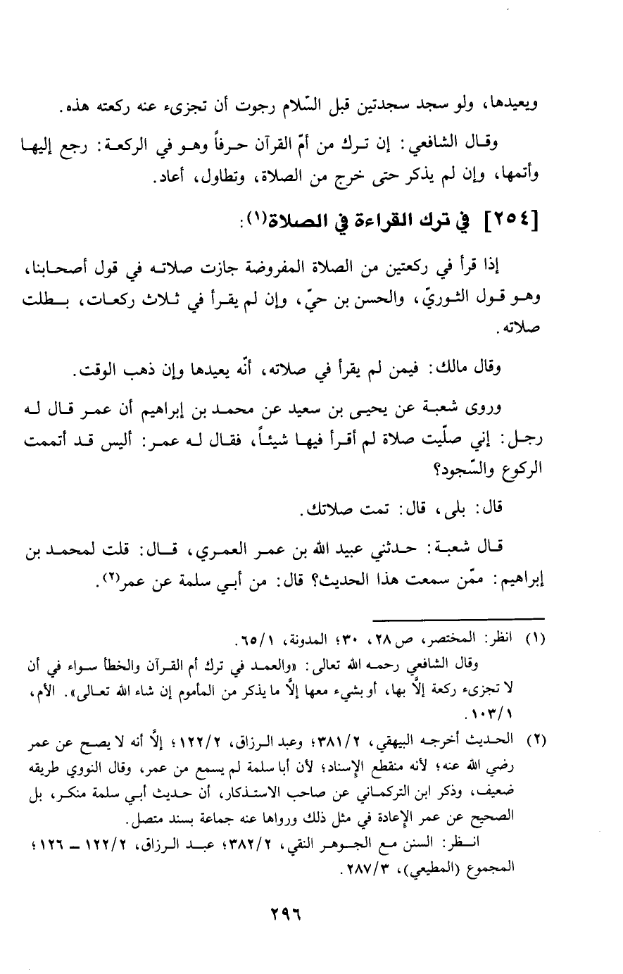 254 - فِي ترك الْقِرَاءَة فِي الصَّلَاة