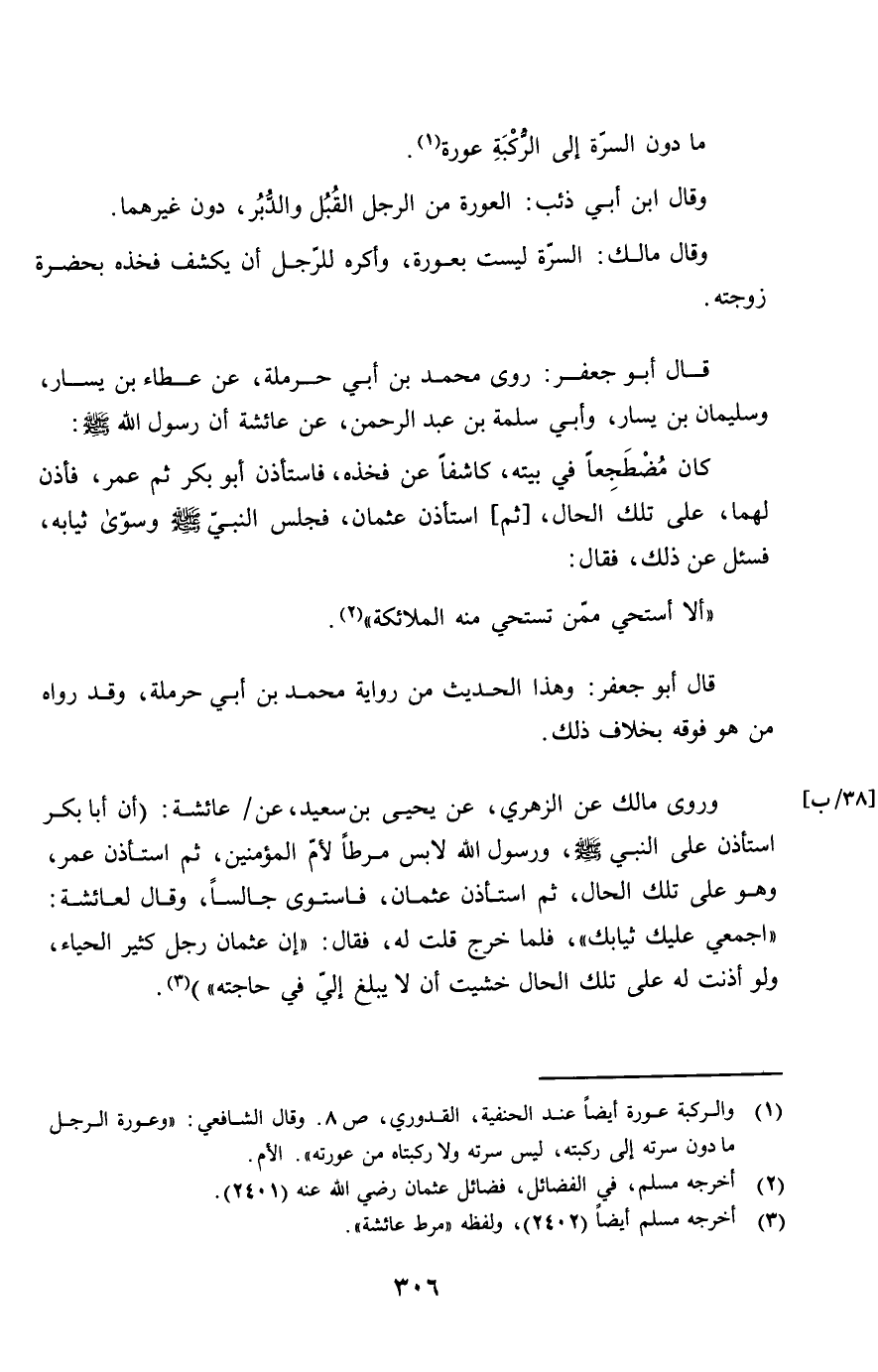 قَالَ أَبُو جَعْفَر روى مُحَمَّد بن أبي حَرْمَلَة عَن عَطاء بن يسَار وَسليمَان بن يسَار وَأبي سَلمَة بن عبد الرَّحْمَن عَن عَائِشَة أَن رَسُول الله صلى الله عَلَيْهِ وَسلم كَانَ مُضْطَجعا فِي بَيته كاشفا عَن فَخذه فَاسْتَأْذن أَبُو بكر ثمَّ عمر فَأذن لَهما على تِلْكَ الْحَال ثمَّ اسْتَأْذن عُثْمَان فَجَلَسَ النَّبِي صلى الله عَلَيْهِ وَسلم وَسوى ثِيَابه فَسئلَ عَن ذَلِك فَقَالَ