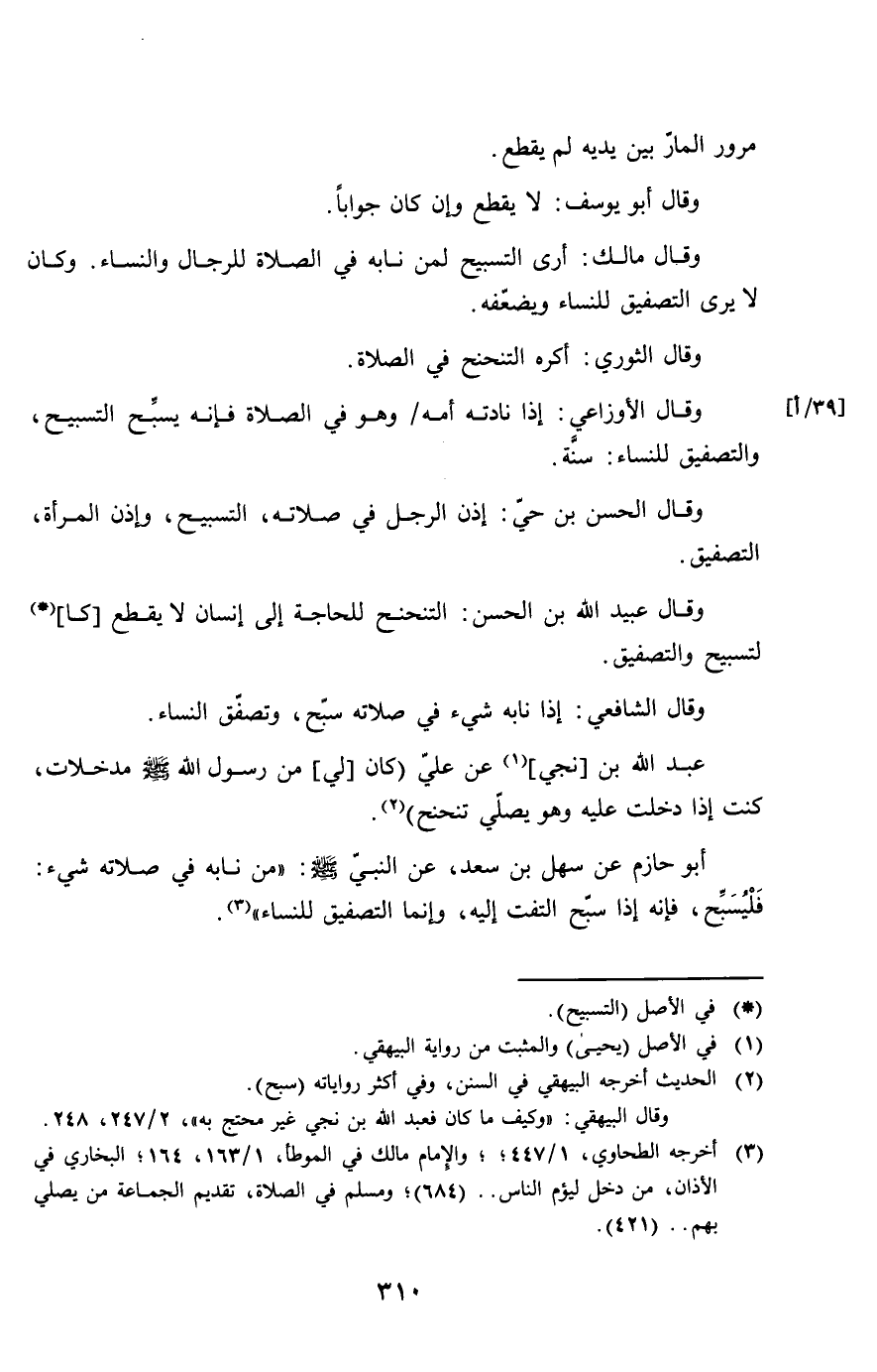 وَقَالَ مَالك أرى التَّسْبِيح لمن نابه فِي الصَّلَاة للرِّجَال وَالنِّسَاء وَكَانَ لَا يرى التصفيق للنِّسَاء ويضعفه