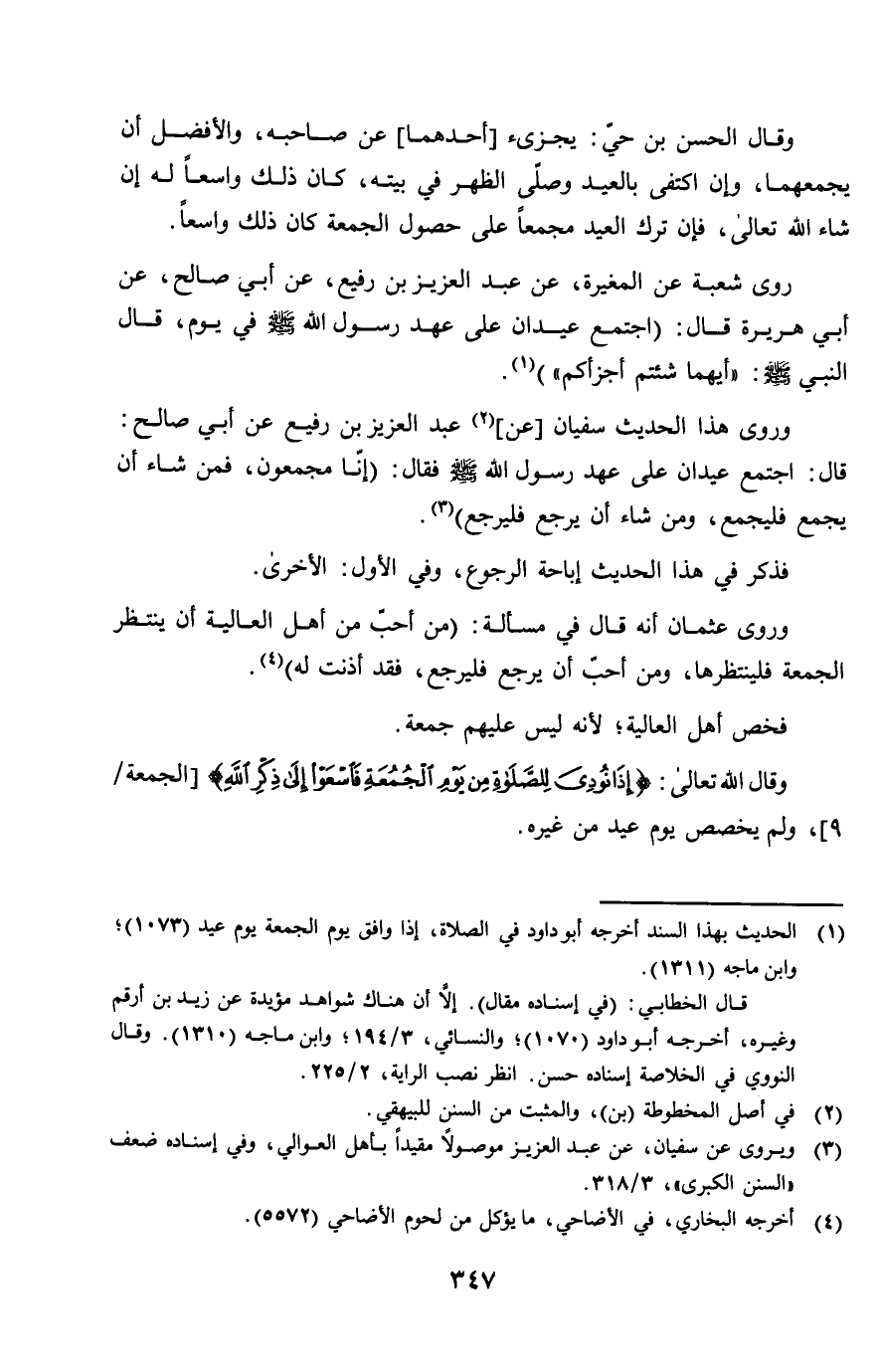 وروى هَذَا الحَدِيث سُفْيَان عَن عبد الْعَزِيز بن رفيع عَن أبي صَالح قَالَ اجْتمع عيدَان على عهد رَسُول الله صلى الله عَلَيْهِ وَسلم فَقَالَ إِنَّا مجمعون فَمن شَاءَ أَن يجمع فليجمع وَمن شَاءَ أَن يرجع فَليرْجع