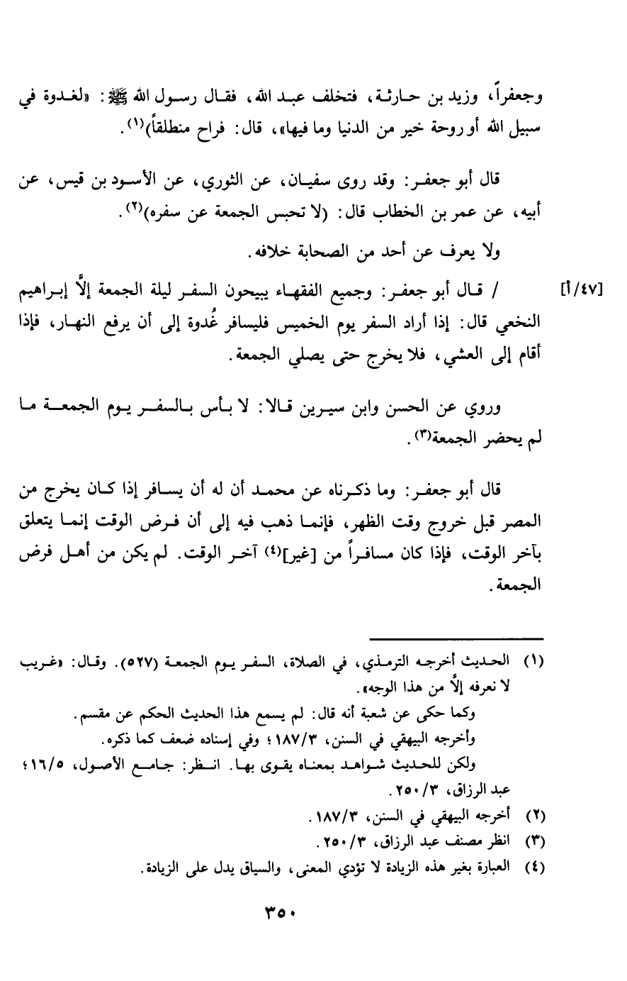 قَالَ أَبُو جَعْفَر وَقد روى سُفْيَان عَن الثَّوْريّ عَن الْأسود بن قيس عَن أَبِيه عَن عمر بن الْخطاب قَالَ لَا تحبس الْجُمُعَة عَن سفرة
