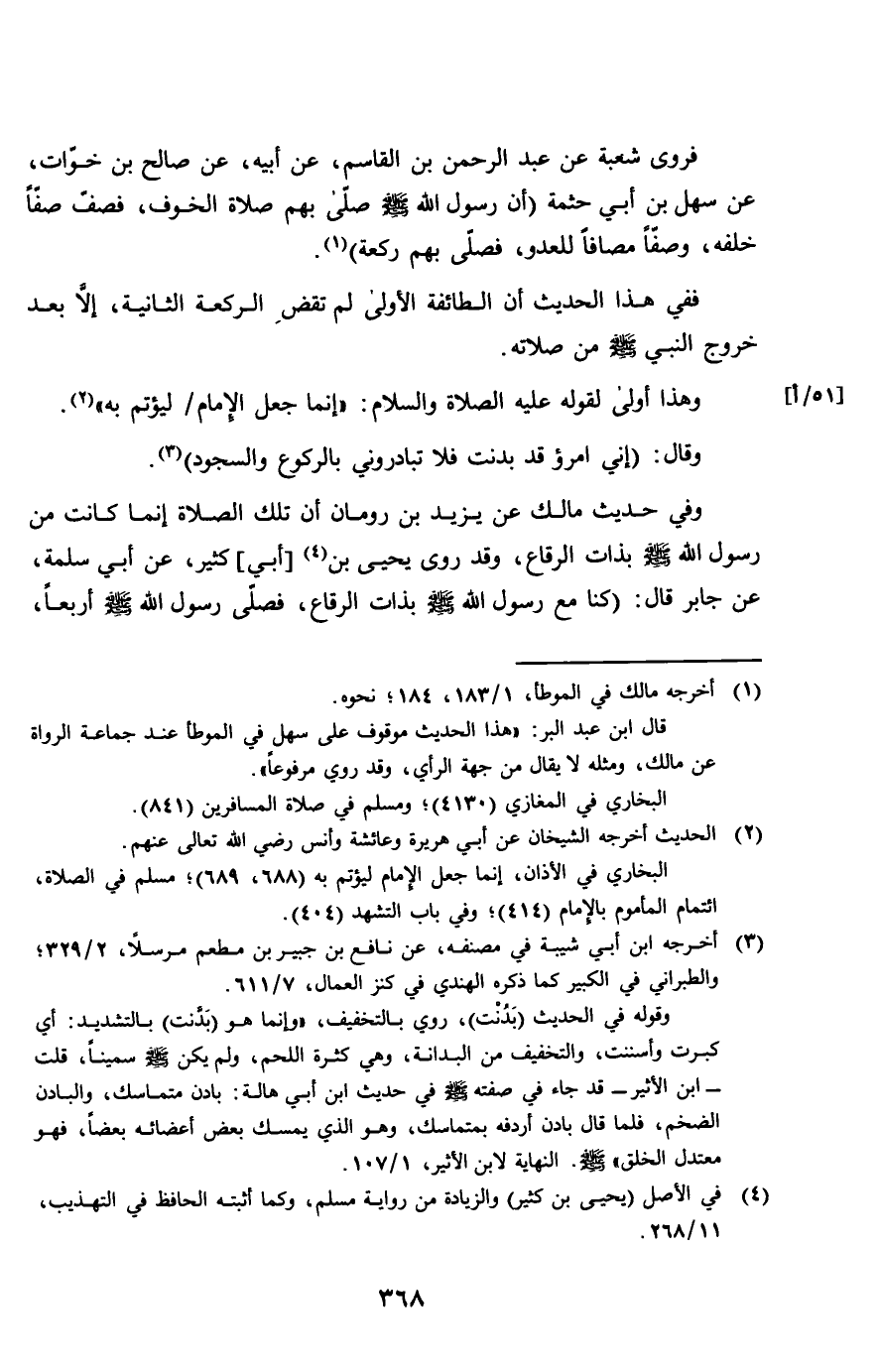 فروى شُعْبَة عَن عبد الرَّحْمَن بن الْقَاسِم عَن أَبِيه عَن صَالح بن خَوات عَن سهل بن أبي حثْمَة أَن رَسُول الله صلى الله عَلَيْهِ وَسلم صلى بهم صَلَاة الْخَوْف فَصف صفا خَلفه وَصفا مصافا لِلْعَدو فصلى بهم رَكْعَة