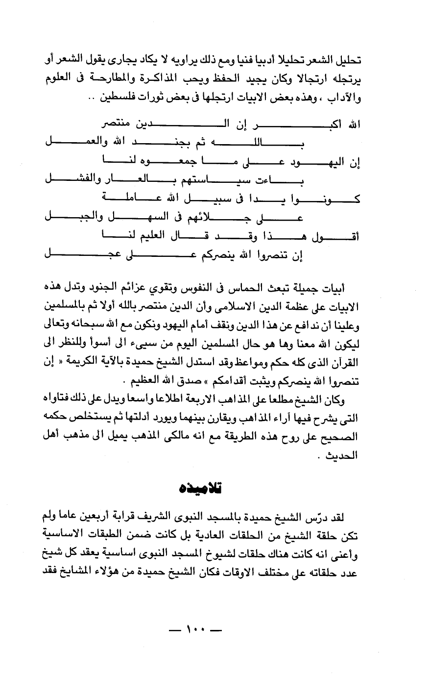 أبيات جميلة تبعث الحماس في النفوس وتقوي عزائم الجنود وتدل هذه الأبيات على عظمة الدين الإسلامي وأن الدين منتصر بالله أولاً ثم بالمسلمين وعلينا أن ندافع عن هذا الدين ونقف أمام اليهود ونكون مع الله سبحانه وتعالى ليكون الله معنا وها هو حال المسلمين اليوم من سيء إلى أسوأ وللنظر إلى القرآن الذي كله حكم ومواعظ وقد استدل الشيخ حميدة بالآية الكريمة "إن تنصروا الله ينصركم ويثبت أقدامكم" صدق الله العظيم.