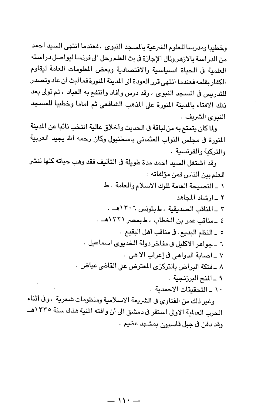 وخطيباً ومدرساً للعلوم الشرعية بالمسجد النبوي، فعندما انتهى السيد أحمد من الدراسة بالأزهر ونال الإجازة في بث العلم رحل إلى فرنسا ليواصل دراسته العلمية في الحياة السياسية والاقتصادية وبعض المعلومات العامة ليقاوم الكفار بقلمه فعندما انتهى قرر العودة إلى المدينة المنورة فما لبث أن عاد وتصدر للتدريس في المسجد النبوي. وقد درس وأفاد وانتفع به العباد، ثم تولى بعد ذلك الإفتاء بالمدينة المنورة على المذهب الشافعي ثم إماماً وخطيباً للمسجد النبوي الشريف. ولما كان يتمتع به من لباقة في الحديث وأخلاق عالية انتخب نائباً عن المدينة المنورة في مجلس النواب العثماني بأسطنبول وكان رحمه الله يجيد العربية والتركية والفرنسية. وقد اشتغل السيد أحمد مدة طويلة في التأليف فقد وهب حياته كلها لنشر العلم بين الناس فمن مؤلفاته: