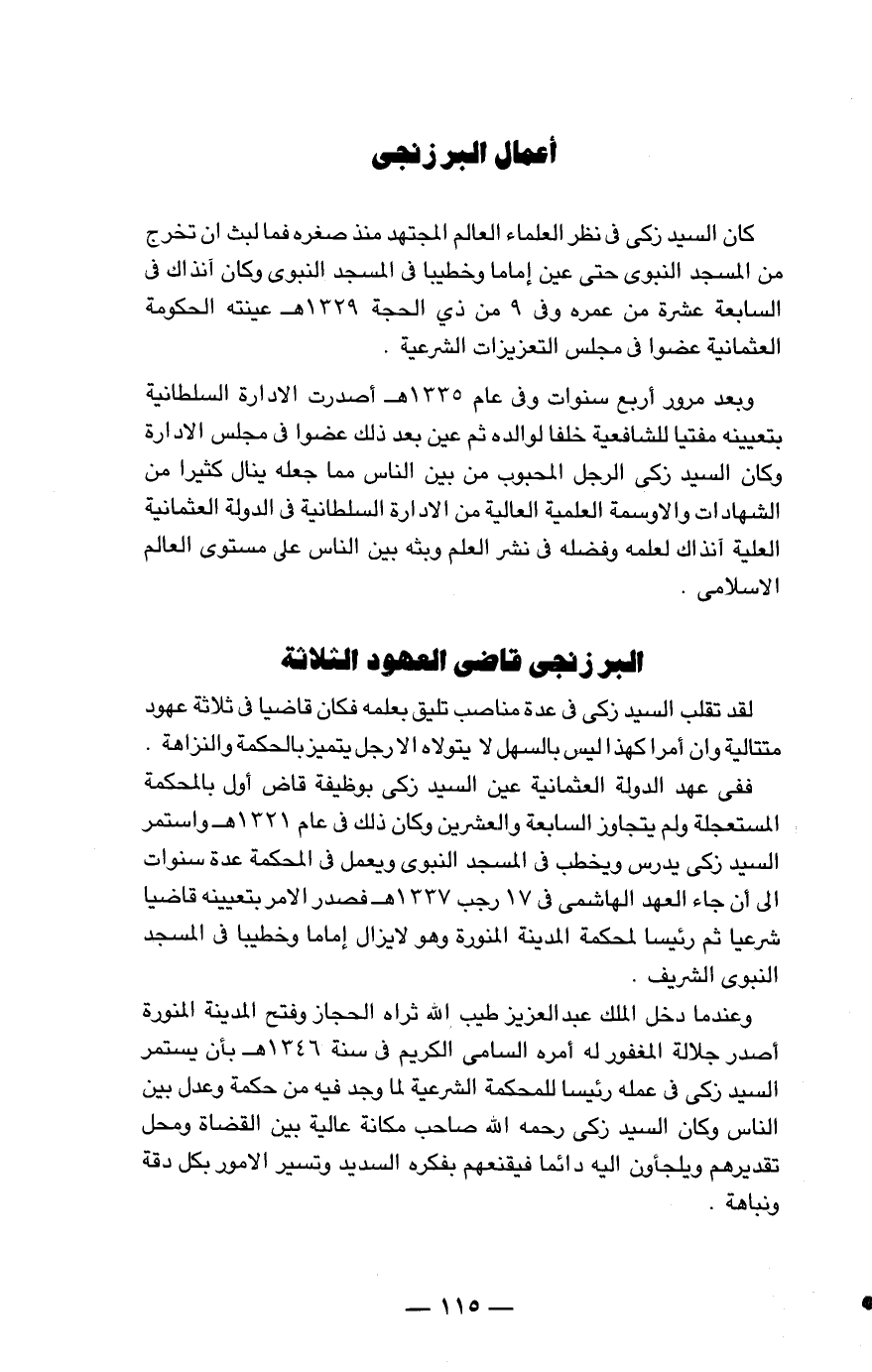 وعندما دخل الملك عبد العزيز طيب الله ثراه الحجاز وفتح المدينة المنورة أصدر جلالة المغفور له أمره السامي الكريم في سنة 1346هـ بأن يستمر السيد زكي في عمله رئيساً للمحكمة الشرعية لما وجد فيه من حكمة وعدل بين الناس وكان السيد زكي رحمه الله صاحب مكانة عالية بين القضاة ومحل تقديرهم ويلجؤون إليه دائماً فيقنعهم بفكره السديد وتسير الأمور بكل دقة ونباهة. ...