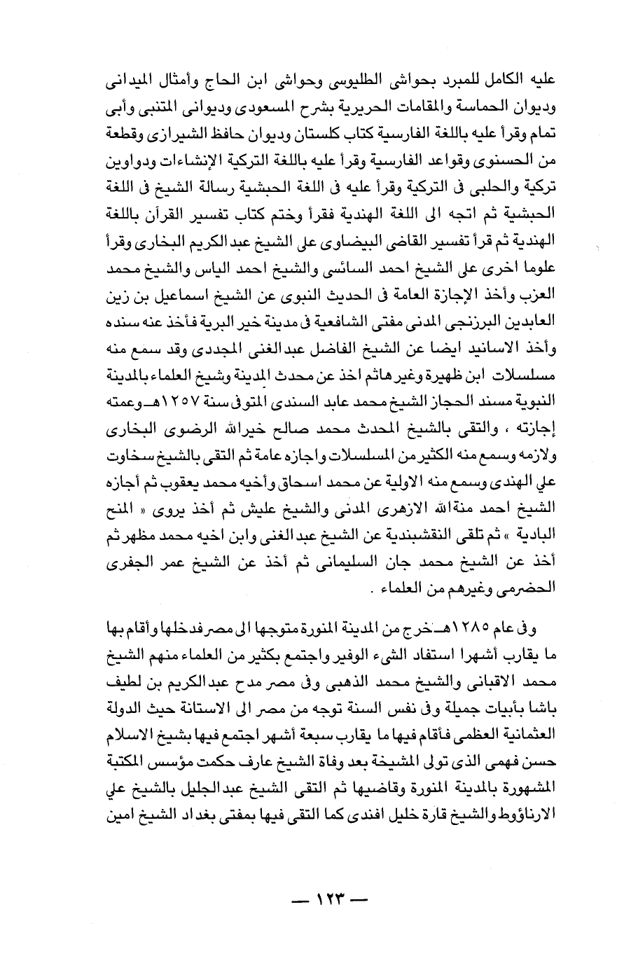 عليه الكامل للمبرد بحواشي الطليوسي وحواشي ابن الحاج وأمثال الميداني وديوان الحماسة والمقامات الحريرية بشرح المسعودي وديواني المتنبي وأبي تمام وقرأ عليه باللغة الفارسية كتاب كلستان وديوان حافظ الشيرازي وقطعة من الحسنوي وقواعد الفارسية وقرأ عليه باللغة التركية الإنشاءات ودواوين تركية والحلبي في التركية وقرأ عليه في اللغة الحبشية رسالة الشيخ في اللغة الحبشية ثم اتجه إلى اللغة الهندية فقرأ وختم كتاب تفسير القرآن باللغة الهندية ثم قرأ تفسير القاضي البيضاوي على الشيخ عبد الكريم البخاري وقرأ علوماً أخرى على الشيخ أحمد السائسي والشيخ أحمد إلياس والشيخ محمد العزب وأخذ الإجازة العامة في الحديث النبوي عن الشيخ إسماعيل بن زين العابدين والبرزنجي المدني مفتي الشافعية في مدينة خير البرية فأخذ عنه سنده وأخذ الأسانيد أيضاً عن الشيخ الفاضل عبد الغني المجددي وقد سمع منه مسلسلات ابن ظهيرة وغيرها ثم أخذ عن محدث المدينة وشيخ العلماء بالمدينة النبوية مسند الحجاز الشيخ محمد عابد السندي المتوفى سنة 1257هـ وعمته إجازته، والتقى بالشيخ المحدث محمد صالح خير الله الرضوي البخاري ولازمه وسمع منه الكثير من المسلسلات وإجازه عامة ثم التقى بالشيخ سخاوت علي الهندي وسمع منه الأولية عن محمد إسحاق وأخيه محمد يعقوب ثم أجازه الشيخ أحمد منة الله الأزهري المدني والشيخ عليش ثم أخذ يروي "المنح البادية " ثم تلقى النقشبندية عن الشيخ عبد الغني وابن أخيه محمد مظهر ثم أخذ عن الشيخ محمد جان السليماني ثم أخذ عن الشيخ عمر الجفري الحضرمي وغيرهم من العلماء.