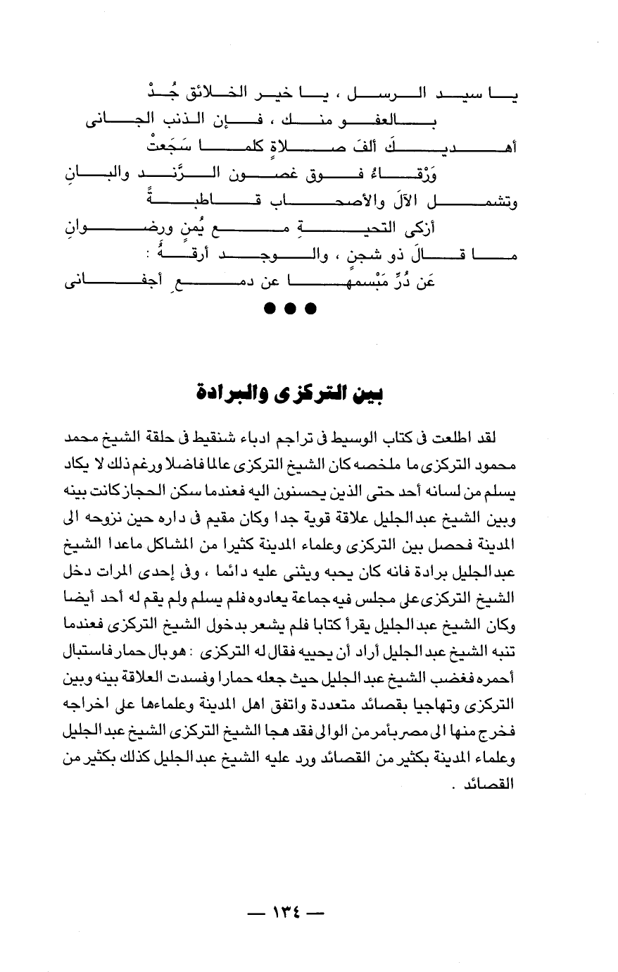 لقد اطلعت في كتاب الوسيط في تراجم أدباء شنقيط في حلقة الشيخ محمد محمود التركزي ما ملخصه كان الشيخ التركزي عالماً فاضلاً ورغم ذلك لا يكاد يسلم من لسانه أحد حتى الذين يحسنون إليه فعندما سكن الحجاز كانت بينه وبين الشيخ عبد الجليل علاقة قوية جداً وكان مقيم في داره حين نزوحه إلى المدينة فحصل بين التركزي وعلماء المدينة كثيراً من المشاكل ما عدا الشيخ عبد الجليل برادة فإنه كان يحبه ويثني عليه دائما ً، وفي إحدى المرات دخل الشيخ التركزي على مجلس فيه جماعة يعادوه فلم يسلم ولم يقم له أحد أيضاً وكان الشيخ عبد الجليل يقرأ كتاباً فلم يشعر بدخول الشيخ التركزي فعندما تنبه الشيخ عبد الجليل أراد أن يحييه فقال له التركزي: هو بال حمار فاستبال أحمره فغضب الشيخ عبد الجليل حيث جعله حماراً وفسدت العلاقة بينه وبين التركزي وتهاجيا بقصائد متعددة واتفق أهل المدينة وعلماءها على إخراجه فخرج منها إلى مصر بأمر من الوالي فقد هجا الشيخ التركزي الشيخ عبد الجليل علماء المدينة بكثير من القصائد ورد عليه الشيخ عبد الجليل كذلك بكثير من القصائد. ...