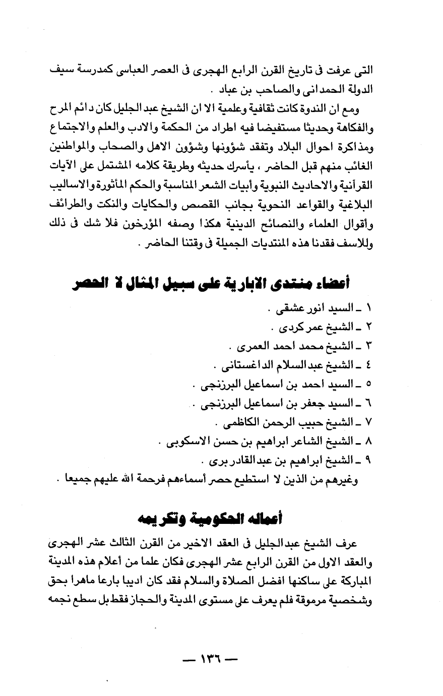 عرف الشيخ عبد الجليل في العقد الأخير من القرن الثالث عشر الهجري والعقد الأول من القرن الرابع عشر الهجري فكان علماً من أعلام هذه المدينة المباركة على ساكنها أفضل الصلاة والسلام فقد كان أديباً بارعاً ماهراً بحق وشخصية مرموقة فلم يعرف على مستوى المدينة والحجاز فقط بل سطع نجمه ...