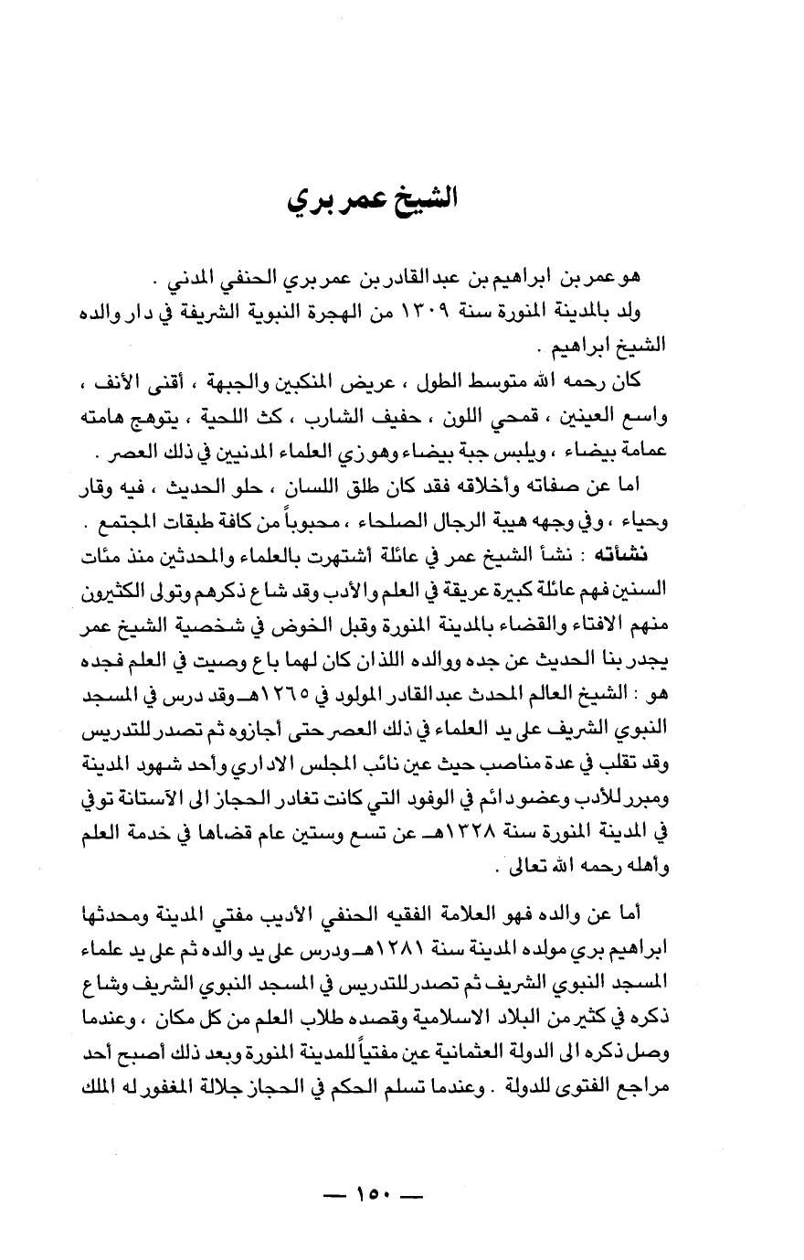هو عمر بن إبراهيم بن عبد القادر بن عمر بري الحنفي المدني. ولد بالمدينة المنورة سنة 1309 من الهجرة النبوية الشريفة في دار والده الشيخ إبراهيم.