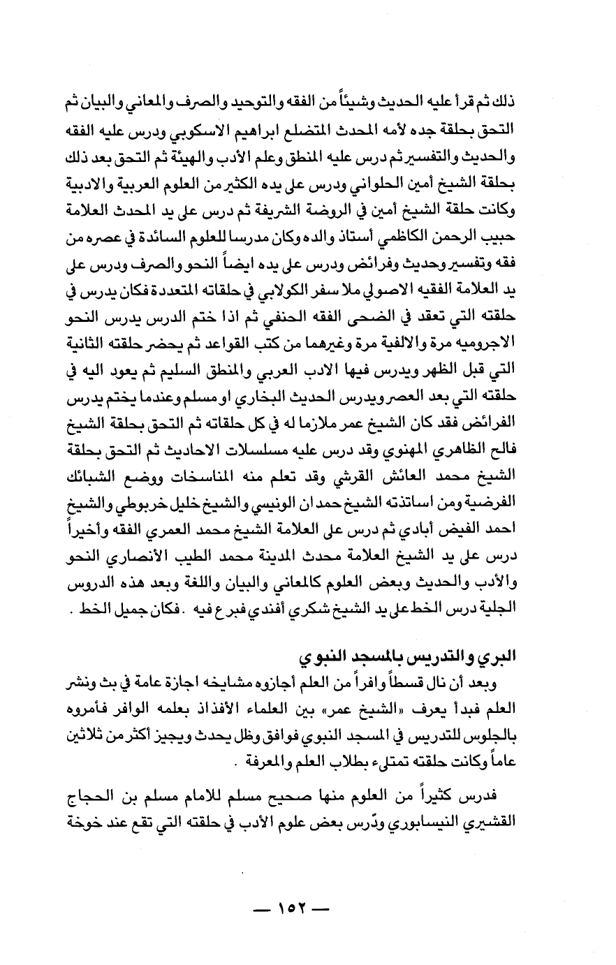ذلك ثم قرأ عليه الحديث وشيئاً من الفقه والتوحيد والصرف والمعاني والبيان ثم التحق بحلقة جده لأمه المحدث المتضلع إبراهيم الأسكوبي ودرس عليه الفقه والحديث والتفسير ثم درس عليه المنطق وعلم الأدب والهيئة ثم التحق بعد ذلك بحلقة الشيخ أمين الحلواني ودرس على يده الكثير من العلوم العربية والأدبية حبيب الرحمن الكاظمي أستاذ والده وكان مدرساً للعلوم السائدة في عصره من فقه وتفسير وحديث وفرائض ودرس على يده أيضاً النحو والصرف ودرس على يد العلامة الفقيه الأصولي ملا سفر الكولابي في حلقاته المتعددة فكان يدرس في حلقته التي تعقد في الضحى الفقه الحنفي ثم إذا ختم الدرس يدرس النحو الأجرومية مرة والألفية مرة وغيرهما من كتب القواعد ثم يحضر حلقته الثانية التي قبل الظهر ويدرس فيها الأدب العربي والمنطق السليم ثم يعود إليه في حلقته التي بعد العصر ويدرس الحديث البخاري أو مسلم وعندما يختم يدرس الفرائض فقد كان الشيخ عمر ملازماً له في كل حلقاته ثم التحق بحلقة الشيخ فالح الظاهري المهنوي وقد درس عليه مسلسلات الأحاديث ثم التحق بحلقة الشيخ محمد العائش القرشي وقد تعلم منه المناسخات ووضع الشبائك الفرضية ومن أساتذته الشيخ حمدان الونيسي والشيخ خليل خربوطي والشيخ أحمد الفيض أبادي ثم درس على العلامة الشيخ محمد العمري والفقه وأخيراً درس على يد الشيخ العلامة محدث المدينة محمد الطيب الأنصاري النحو والأدب والحديث وبعض العلوم كالمعاني والبيان واللغة وبعد هذه الدروس الجلية درس الخط على يد الشيخ شكري أفندي فبرع فيه، فكان جميل الخط.