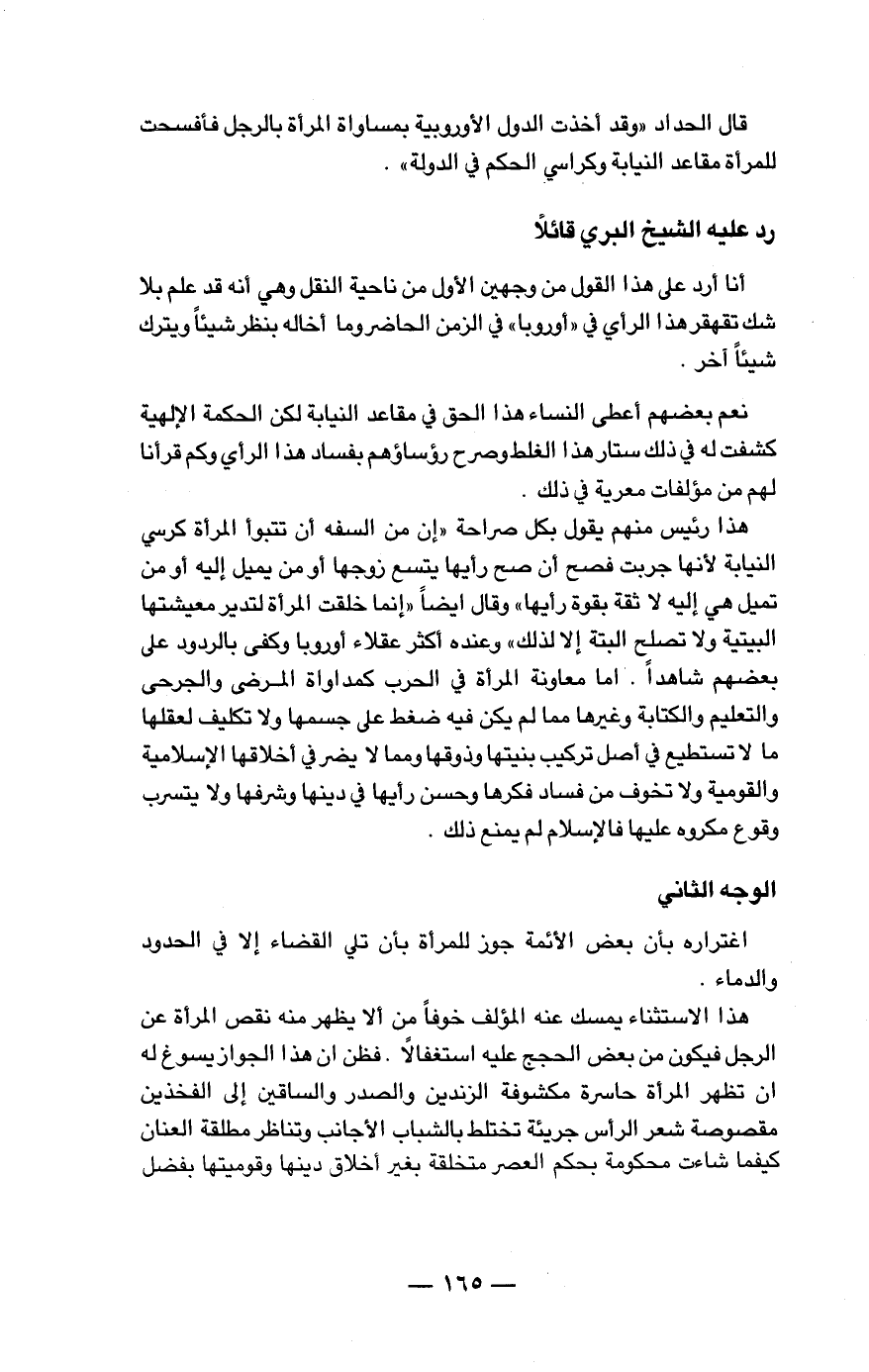 اغتراره بأن بعض الأئمة جوز للمرأة بأن تلي القضاء إلا في الحدود والدماء. هذا الاستثناء يمسك عنه المؤلف خوفاً من ألا يظهر منه نقص المرأة عن الرجل فيكون من بعض الحجج عليه استغفالاً. فظن أن هذا الجواز يسوغ له أن تظهر المرأة حاسرة مكشوفة الزندين والصدر والساقين إلى الفخذين مقصوصة شعر الرأس جريئة تختلط بالشباب الأجانب وتناظر مطلقة العنان كيفما شاءت محكومة بحكم العصر متخلفة بغير أخلاق دينها وقوميتها بفضل ...