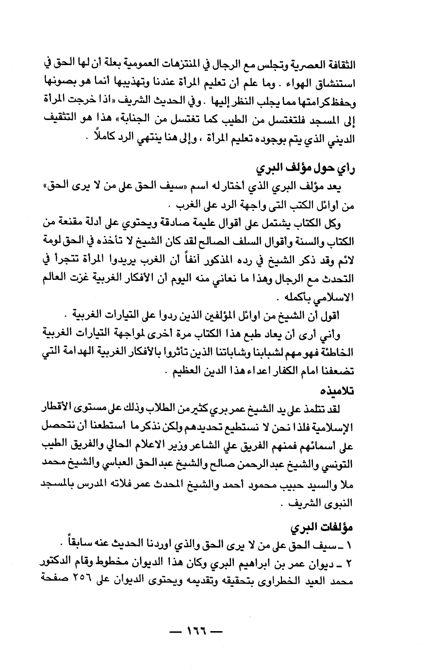 الثقافة العصرية وتجلس مع الرجال في المنتزهات العمومية بعلة أن لها الحق في استنشاق الهواء. وما علم أن تعليم المرأة عندنا وتهذيبها إنما هو بصونها وحفظ كرامتها مما يجلب النظر إليها. وفي الحديث الشريف "إذا خرجت المرأة إلى المسجد فلتغتسل من الطيب كما تغتسل من الجنابة " هذا هو التثقيف الديني الذي يتم بوجوده تعليم المرأة، وإلى هنا ينتهي الرد كاملاً.