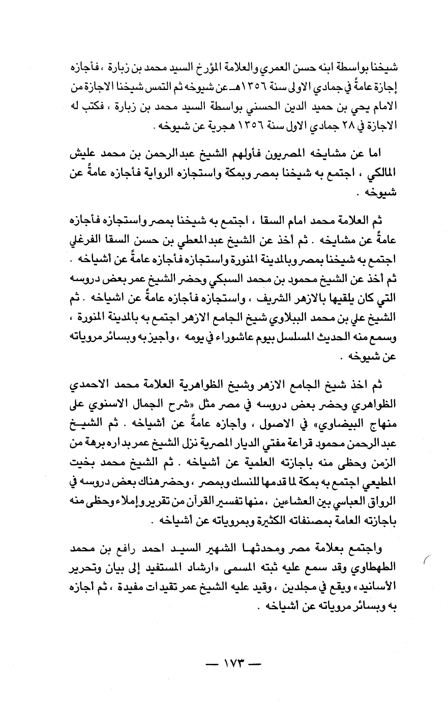 ... شيخنا بواسطة ابنه حسن العمري والعلامة المؤرخ السيد محمد بن زبارة، فأجازه إجازة عامة في جمادى الأولى سنة 1356هـ عن شيوخه ثم التمس شيخنا الإجازة من الإمام يحيى بن حميد الدين الحسني بواسطة السيد محمد بن زبارة، فكتب له الإجازة في 28 جمادى الأول سنة 1356هجرية عن شيوخه. أما عن مشايخه المصريون فأولهم الشيخ عبد الرحمن بن محمد عليش المالكي، اجتمع به شيخنا بمصر وبمكة واستجازه الرواية فأجازه عامة عن شيوخه.