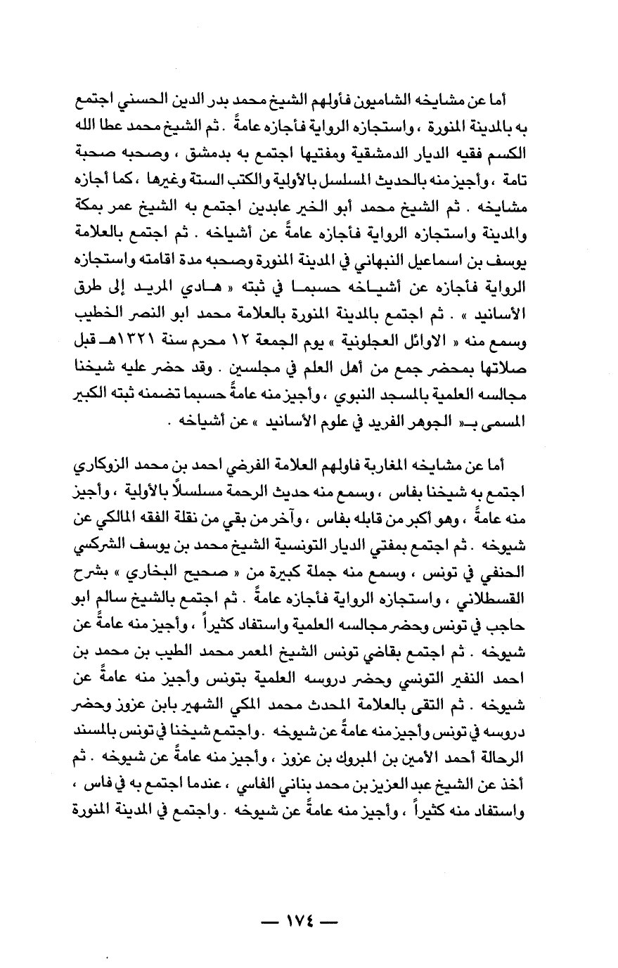 أما عن مشايخه المغاربة فأولهم العلامة الفرضي أحمد بن محمد الزوكاري اجتمع به شيخنا بفاس، وسمع منه حديث الرحمة مسلسلاً بالأولية، وأجيز منه عامة، وهو أكبر من قابله بفاس، وآخر من بقي من نقلة الفقه المالكي عن شيوخه، ثم اجتمع بمفتي الديار التونسية الشيخ محمد بن يوسف الشركسي الحنفي في تونس، وسمع منه جملة كبيرة من "صحيح البخاري " بشرح القسطلاني، واستجازه الرواية فأجازه عامة. ثم اجتمع بالشيخ سالم أبو حاجب في تونس وحضر مجالسه العلمية واستفاد كثيراً، وأجيز منه عامة عن شيوخه، ثم اجتمع بقاضي تونس الشيخ المعمر محمد الطيب بن محمد بن أحمد النفير التونسي وحضر دروسه العلمية بتونس وأجيز منه عامة عن شيوخه، ثم التقى بالعلامة المحدث محمد المكي الشهير بابن عزوز وحضر دروسه في تونس وأجيز منه عامة عن شيوخه. واجتمع شيخنا في تونس بالمسند الرحالة أحمد الأمين بن المبروك بن عزوز، وأجيز منه عامة عن شيوخه، ثم أخذ عن الشيخ عبد العزيز بن محمد بناني الفاسي، عندما اجتمع به في فاس، واستفاد منه كثيراً، وأجيز منه عامة عن شيوخه، واجتمع في المدينة المنورة ...