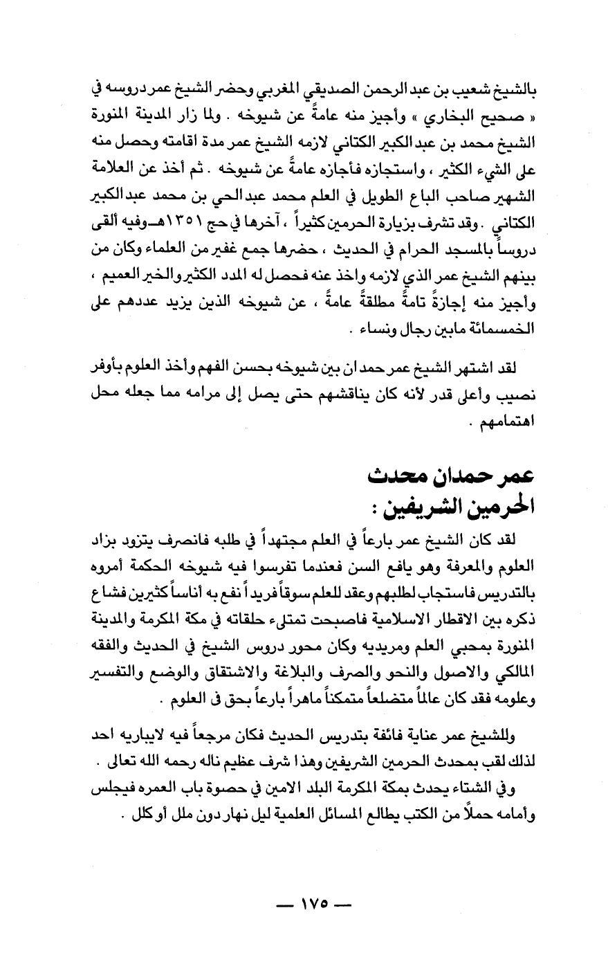 بالشيخ شعيب بن عبد الرحمن الصديقي المغربي وحضر الشيخ عمر دروسه في "صحيح البخاري" وأجيز منه عامة عن شيوخه. ولما زار المدينة المنورة الشيخ محمد بن عبد الكبير الكتاني لازمه الشيخ عمر مدة إقامته وحصل منه على الشيء الكثير، واستجازه فأجازه عامة عن شيوخه. ثم أخذ عن العلامة الشهير صاحب الباع الطويل في العلم محمد عبد الحي بن محمد عبد الكبير الكتاني. وقد تشرف بزيارة الحرمين كثيراً، آخرها في حج 1351هـ وفيه ألقى دروساً بالمسجد الحرام في الحديث، حضرها جمع غفير من العلماء وكان من بينهم الشيخ عمر الذي لازمه وأخذ عنه فحصل له المدد الكثير والخير العميم، وأجيز منه إجازة تامة مطلقة عامة، عن شيوخه الذين يزيد عددهم على الخمسمائة ما بين رجال ونساء. لقد اشتهر الشيخ عمر حمدن بين شيوخه بحسن الفهم وأخذ العلوم بأوفر نصيب وأعلى قدر لأنه كان يناقشهم حتى يصل إلى مرامه مما جعله محل اهتمامهم.