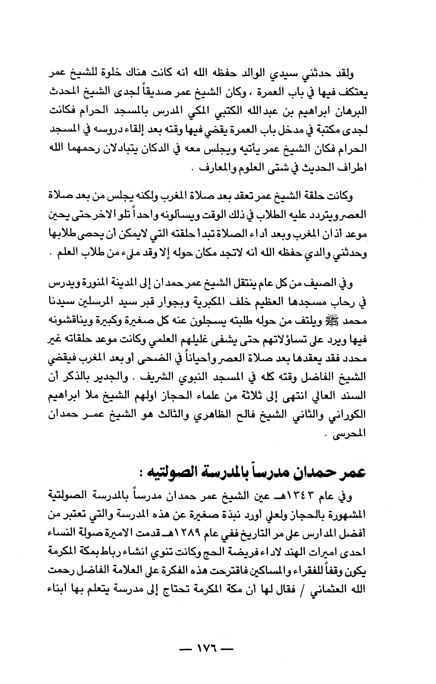 وفي عام 1343هـ عين الشيخ عمر حمدان مدرساً بالمدرسة الصولتية المشهورة بالحجاز ولعلي أورد نبذة صغيرة عن هذه المدرسة والتي تعتبر من أفضل المدارس على مر التاريخ ففي عام 1289هـ قدمت الأميرة صولة النساء إحدى أميرات الهند لأداء فريضة الحج وكانت تنوي إنشاء رباط بمكة المكرمة يكون وقفاً للفقراء والمساكين فاقترحت هذه الفكرة على العلامة الفاضل رحمت الله العثماني / فقال لها أن مكة المكرمة تحتاج إلى مدرس يتعلم بها أبناء ...