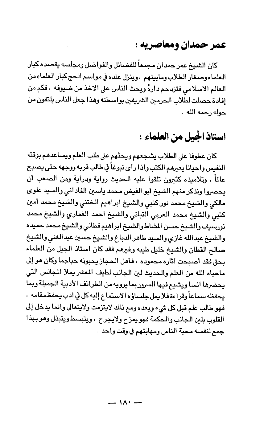 كان عطوفاً على الطلاب يشجعهم ويحثهم على طلب العلم ويساعدهم بوقته النفيس وأحياناً يعيرهم الكتب وإذا رأى نبوغاً في طالب قربه ووجهه حتى يصبح عالماً، وتلاميذه كثيرون تلقوا عليه الحديث رواية ودراية ومن الصعب أن يحصروا ونذكر منهم الشيخ أبو الفيض محمد ياسين الفاداني والسيد علوي مالكي والشيخ محمد نور كتبي والشيخ إبراهيم الختني والشيخ محمد أمين كتبي والشيخ محمد العربي التباني والشيخ أحمد الغماري والشيخ محمد نور سيف والشيخ حسن المشاط والشيخ إبراهيم فطاني والشيخ محمد حميدة والشيخ عبد الله غازي والسيد طاهر الدباغ والشيخ حسين عبد الغني والشيخ صالح القطان والشيخ خليل طيبة وغيرهم فقد كان أستاذ الجيل من العلماء بحق فقد أصبحت آثاره محمودة، فأهل الحجاز يحبونه حباً جماً وكان هو إلى ما حباه الله من العلم والحديث لين الجانب لطيف المعشر يملأ المجالس التي يحضرها أنساً ويشيع فيها السرور بما يرويه من الطرائف الأدبية الجميلة وبما يحفظه سماعاً وقراءة فلا يمل جلساؤه الاستماع إليه كل في أدب يحفظ مقامه، فهو طالب علم قبل كل شيء وبعده ومع ذلك لا يتزمت ولا يتعالى وإنما يدخل إلى القلوب بلين الجانب والحكمة فهو يمزج ولا يجرح، ويتبسط ويتبذل وهو بهذا جمع لنفسه محبة الناس ومهابتهم في وقت واحد .. ...