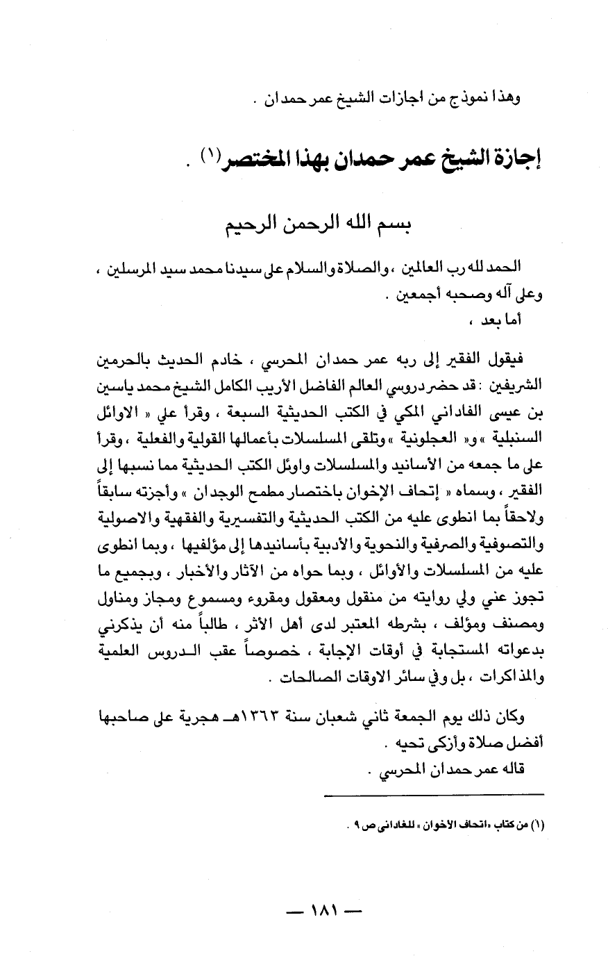 بسم الله الرحمن الرحيم الحمد لله رب العالمين، والصلاة والسلام على سيدنا محمد سيد المرسلين، وعلى آله وصحبه أجمعين. أما بعد، فيقول الفقير إلى ربه عمر حمدان المحرسي، خادم الحديث بالحرمين الشريفين: قد حضر دروسي العالم الفاضل الأريب الكامل الشيخ محمد ياسين بن عيسى الفاداني المكي في الكتب الحديثية السبعة، وقرأ علي " الأوائل السنبلية " و " العجلونية " وتلقى المسلسلات بأعمالها القولية والفعلية، وقرأ على ما جمعه من الأسانيد والمسلسلات وأوائل الكتب الحديثية مما نسبها إلى الفقير، وسماه " إتحاف الإخوان باختصار مطمح الوجدان " وأجزته سابقاً ولاحقاً بما انطوى عليه من الكتب الحديثية والتفسيرية والفقهية والأصولية والتصوفية والصرفية والنحوية والأدبية بأسانيدها إلى مؤلفيها، وبما انطوى عليه من المسلسلات والأوائل، وبما حواه من الآثار والأخبار، وبجميع ما تجوز عني ولي روايته من منقول ومعقول ومقروء ومسموع ومجاز ومناول ومصنف ومؤلف، بشرطه المعتبر لدى أهل الثر، طالباً منه أن يذكرني بدعواته المستجابة في أوقات الإجابة، خصوصاً عقب الدروس العلمية والمذكرات، بل وفي سائر الأوقات الصالحات.