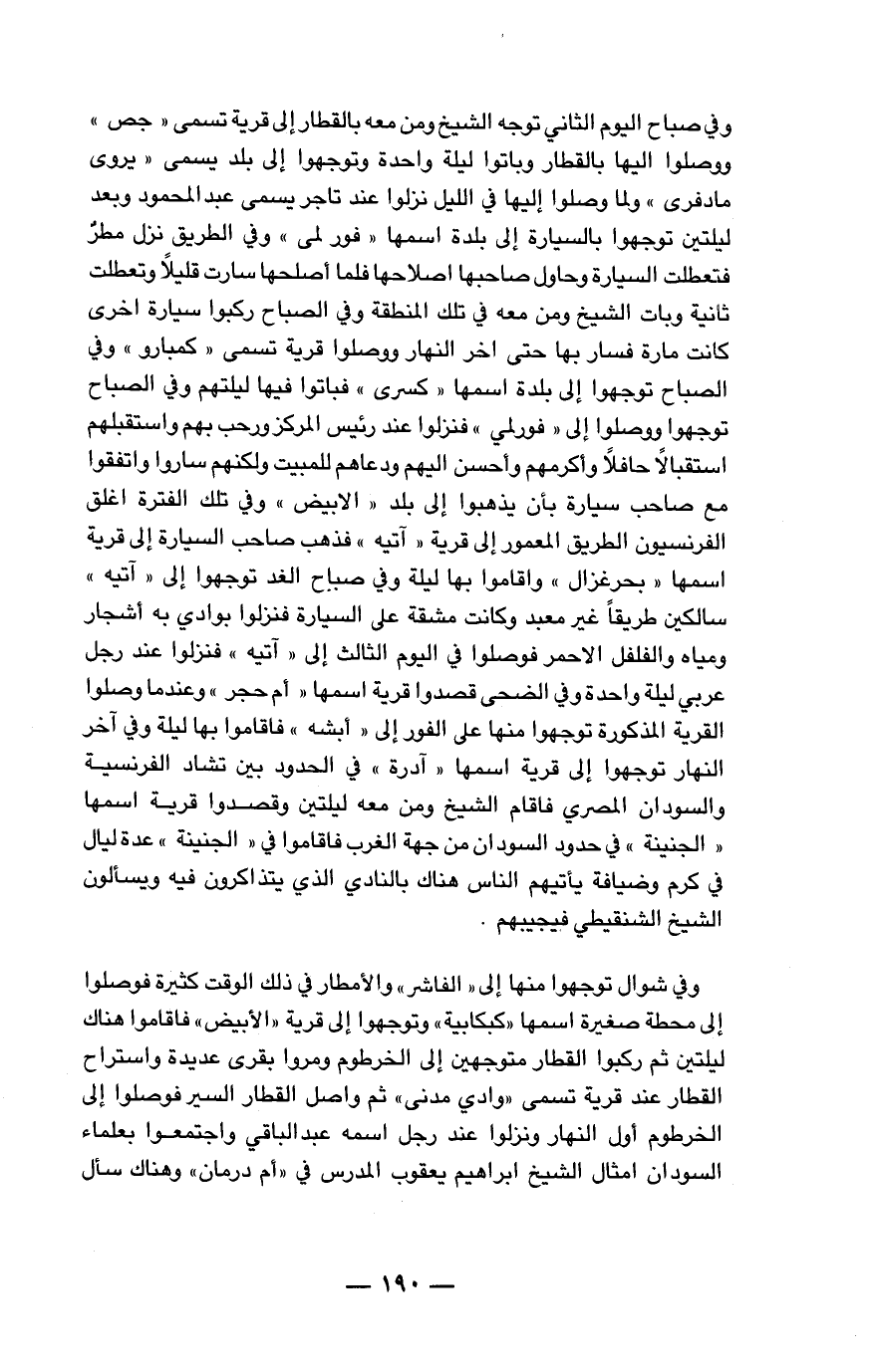 وفي شوال توجهوا منها إلى " الفاشر " والأمطار في ذلك الوقت كثيرة فوصلوا إلى محطة صغيرة اسمها "كبكابية" وتوجهوا إلى قرية " الأبيض " فأقاموا هناك ليلتين ثم ركبوا القطار متوجهين إلى الخرطوم ومروا بقرى عديدة واستراح القطار عند قرية تسمى "وادي مدني " ثم واصل القطار السير فوصلوا إلى الخرطوم أول النهار ونزلوا عند رجل اسمه عبد الباقي واجتمعوا بعلماء السودان أمثال الشيخ إبراهيم يعقوب المدرس في "أم درمان" وهناك سأل ...