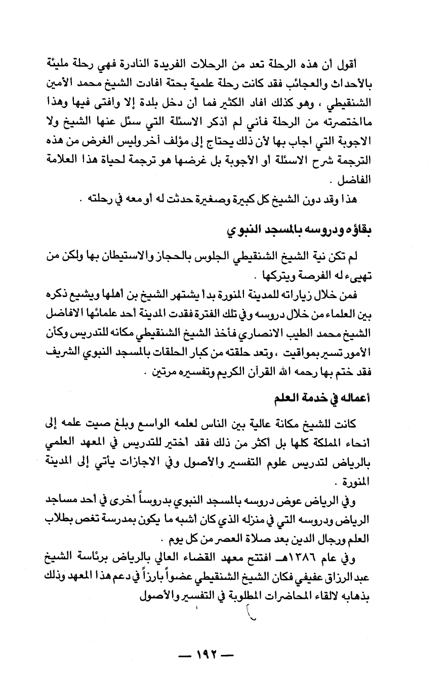 وفي الرياض عوض دروسه بالمسجد النبوي بدروس أخرى في أحد مساجد الرياض ودروسه التي في منزله الذي كان أشبه ما يكون بمدرسة تغص بطلاب العلم ورجال الدين بعد صلاة العصر من كل يوم. وفي عام 1386هـ افتتح معهد القضاء العالي بالرياض برئاسة الشيخ عبد الرزاق عفيفي فكان الشيخ الشنقيطي عضواً بارزاً في دعم هذا المعهد وذلك بذهابه لإلقاء المحاضرات المطلوبة في التفسير والأصول. ...