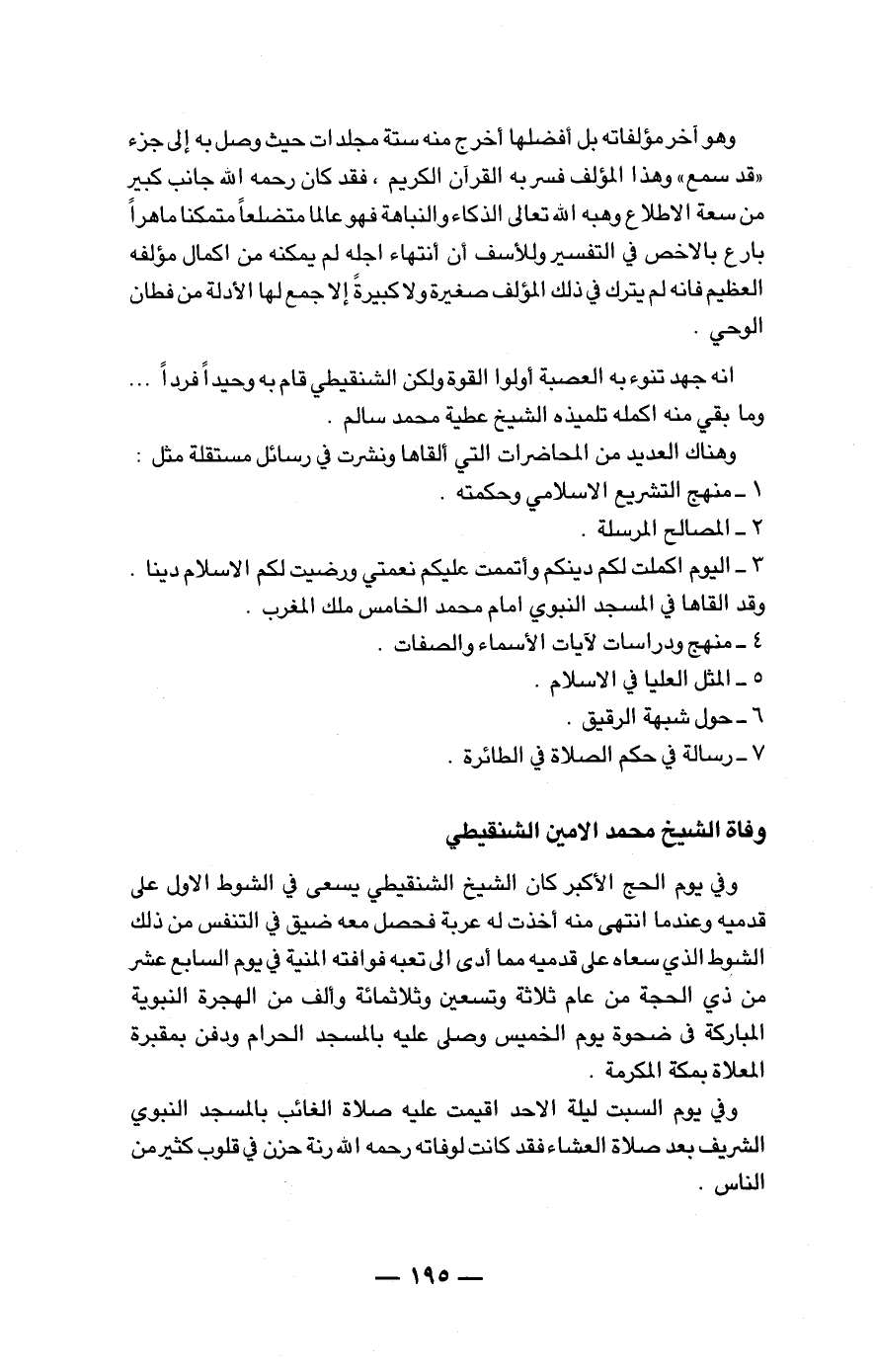 إنه جهد تنوء به العصبة أولوا القوة ولكن الشنقيطي قام به وحيداً فرداً ... وما بقي منه أكمله تلميذه الشيخ عطية محمد سالم. وهناك العديد من المحاضرات التي ألقاها ونشرت في رسائل مستقلة مثل: