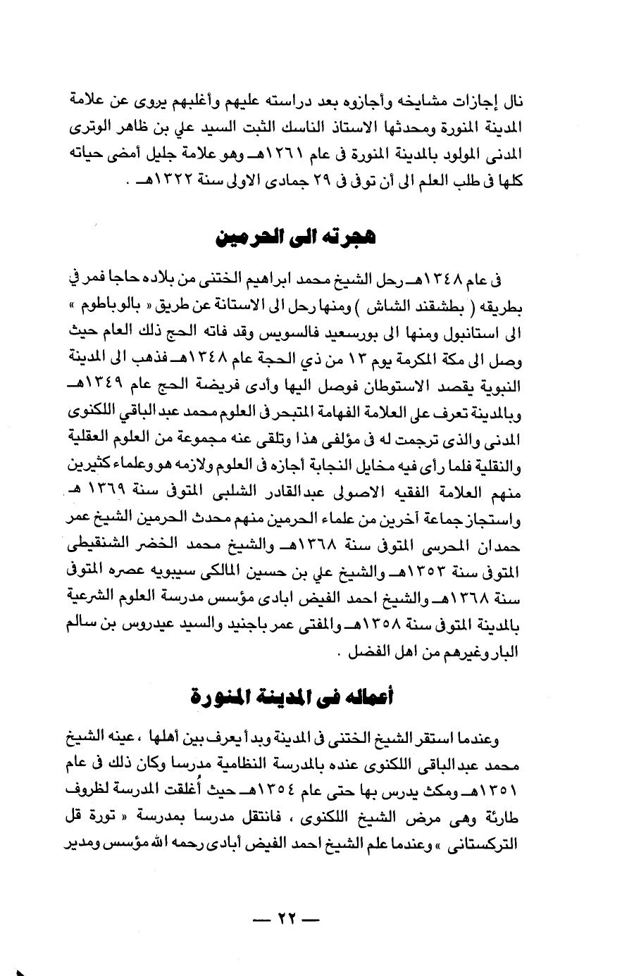 في عام 1248هـ رحل الشيخ محمد إبراهيم الختني من بلاده حاجاً فمر في طريقه (بطشقند الشاش) ومنها رحل إلى الأستانة عن طريق "بالوباطوم" وصل إلى مكة المكرمة يوم 13 من ذي الحجة عام 1348هـ فذهب إلى المدينة النبوية يقصد الإستوطان فوصل إليها وأدى فريضة الحج عام 1349هـ وبالمدينة تعرف على العلامة الفهامة المتبحر في العلوم محمد عبد الباقي اللكنوي المدني والذي ترجمت له في مؤلفي هذا وتلقى عنه مجموعة من العلوم العقلية والنقلية فلما رأى فيه مخايل النجابة أجازه في العلوم ولازمه هو وعلماء كثيرين منهم العلامة الفقيه الأصولي عبد القادر الشلبي المتوفى سنة 1369هـ واستجاز جماعة آخرين من علماء الحرمين منهم محدث الحرمين الشيخ عمر حمدان المحرسي المتوفي سنة 1368هـ والشيخ محمد الخضر الشنقيطي المتوفى سنة 1353هـ والشيخ علي بن حسين المالكي سيبويه عصره المتوفى سنة 1368هـ والشيخ أحمد الفيض آبادي مؤسس مدرسة العلوم الشرعية بالمدينة المتوفى سنة 1358هـ والمفتي عمر باجنيد والسيد عيدروس بن سالم البار وغيرهم من أهل الفضل.