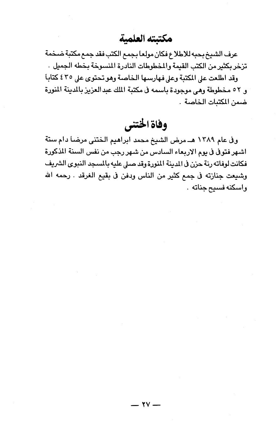 وقد اطلعت على المكتبة وعلى فهارسها الخاصة وهو تحتوي على 435 كتاباً و 52 مخطوطة وهي موجودة باسمه في مكتبة الملك عبد العزيز بالمدينة المنورة ضمن المكتبات الخاصة.