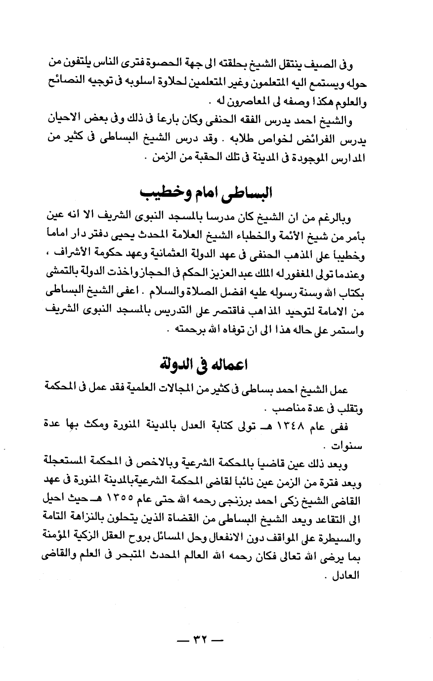 وبالرغم من أن الشيخ كان مدرساً بالمسجد النبوي الشريف إلا أنه عين بأمر من شيخ الأئمة والخطباء الشيخ العلامة المحدث يحيى دفتردار إماماً وخطيباً على المذهب الحنفي في عهد الدولة العثمانية وعهد حكومة الأشراف، وعندما تولى المغفور له الملك عبد العزيز الحكم في الحجاز وأخذت الدولة بالتمشي بكتاب الله وسنة رسوله عليه أفضل الصلاة والسلام. أعفى الشيخ البساطي من الأمانة لتوحيد المذاهب فاقتصر على التدريس بالمسجد النبوي الشريف واستمر على حاله هذا إلى أن توفاه الله برحمته.