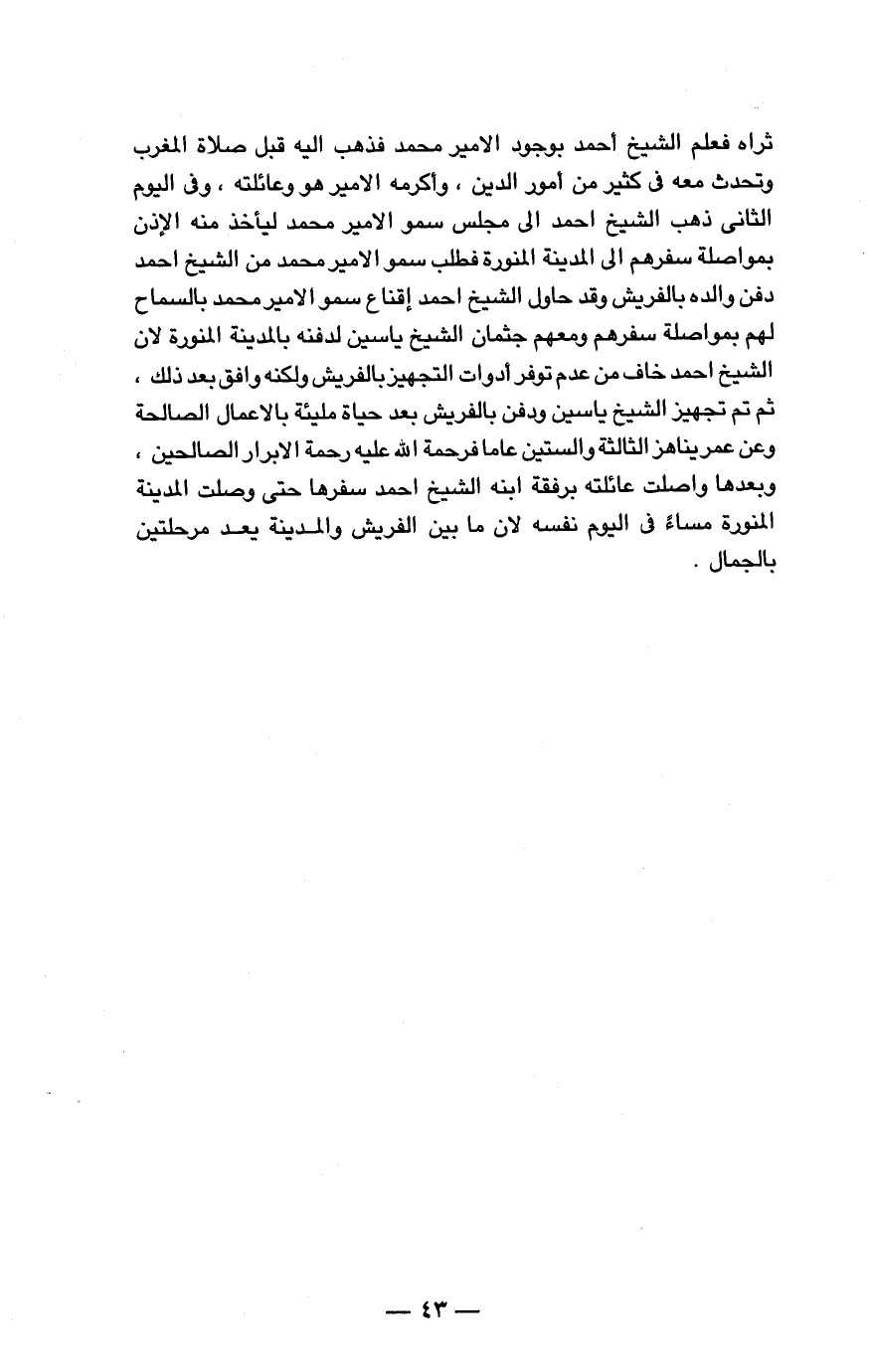 ثراه فعلم الشيخ أحمد بوجود الأمير محمد فذهب إليه قبل صلاة المغرب وتحدث معه في كثير من أمور الدين، وأكرمه الأمير هو وعائلته، وفي اليوم الثاني ذهب الشيخ أحمد إلى مجلس سمو الأمير محمد ليأخذ منه الإذن بمواصلة سفرهم إلى المدينة المنورة فطلب سمو الأمير محمد من الشيخ أحمد دفن والده بالفريش وقد حاول الشيخ أحمد إقناع سمو الأمير محمد بالسماح لهم بمواصلة سفرهم ومعهم جثمان الشيخ ياسين لدفنه بالمدينة المنورة لأن الشيخ أحمد خاف من عدم توفر أدوات التجهيز بالفريش ولكنه وافق بعد ذلك، ثم تم تجهيز الشيخ ياسين ودفن بالفريش بعد حياة مليئة بالأعمال الصالحة وعن عمر يناهز الثالثة والستين عاماً فرحمه الله عليه رحمة الأبرار الصالحين، وبعدها واصلت عائلته برفقة ابنه الشيخ أحمد سفرها حتى وصلت المدينة المنورة مساءً في اليوم نفسه لأن ما بين الفريش والمدينة يعد مرحلتين بالجمال.