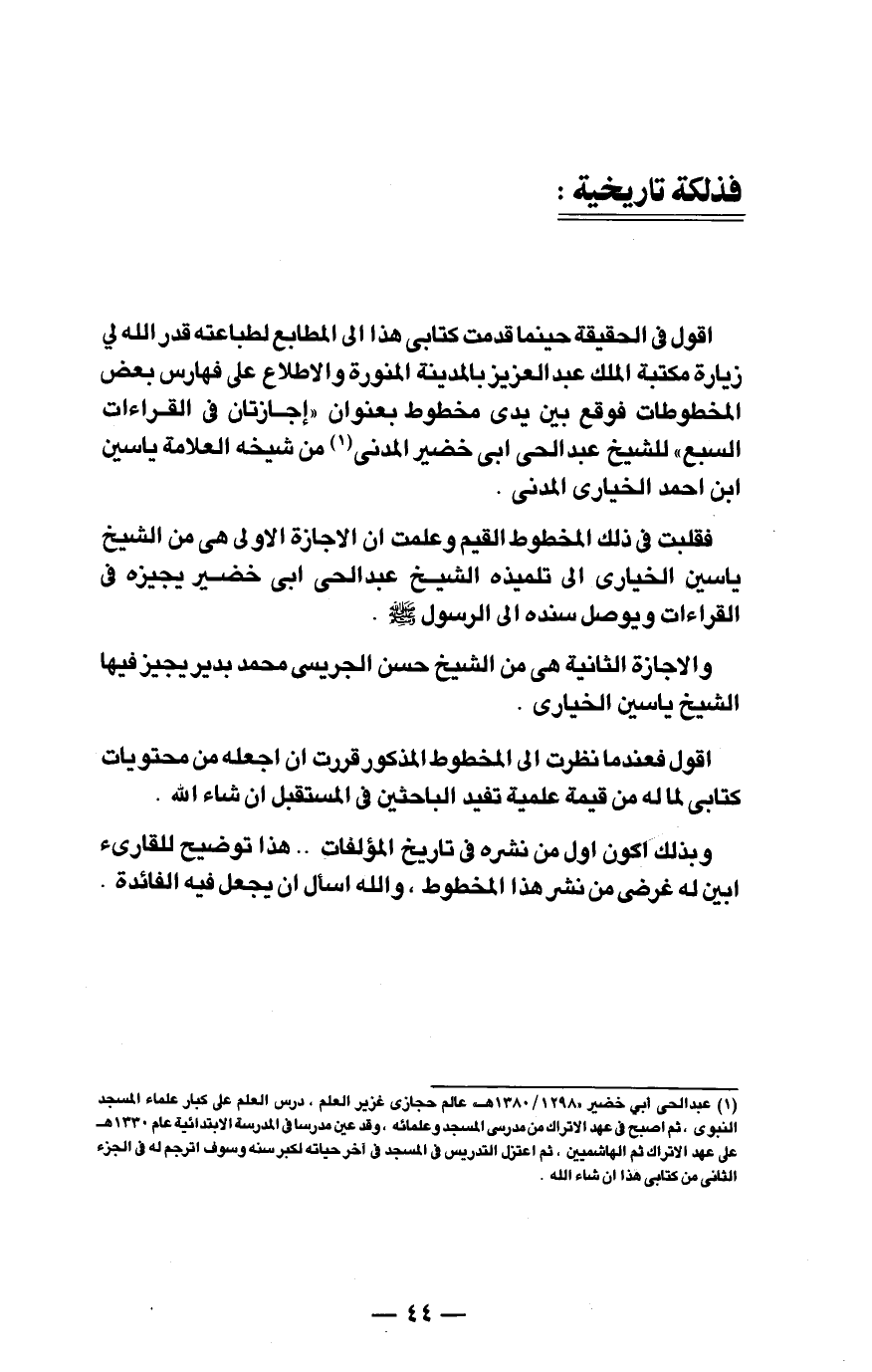 أقول في الحقيقة حينما قدمت كتابي هذا إلى المطابع لطباعته قدر الله في زيارة مكتبة الملك عبد العزيز بالمدينة المنورة والإطلاع على فهارس بعض المخطوطات فوقع بين يدي مخطوط بعنوان "إجازتان في القراءات السبع" للشيخ عبد الحي أبي خضير المدني (1) من شيخه العلامة ياسين ابن أحمد الخياري المدني.