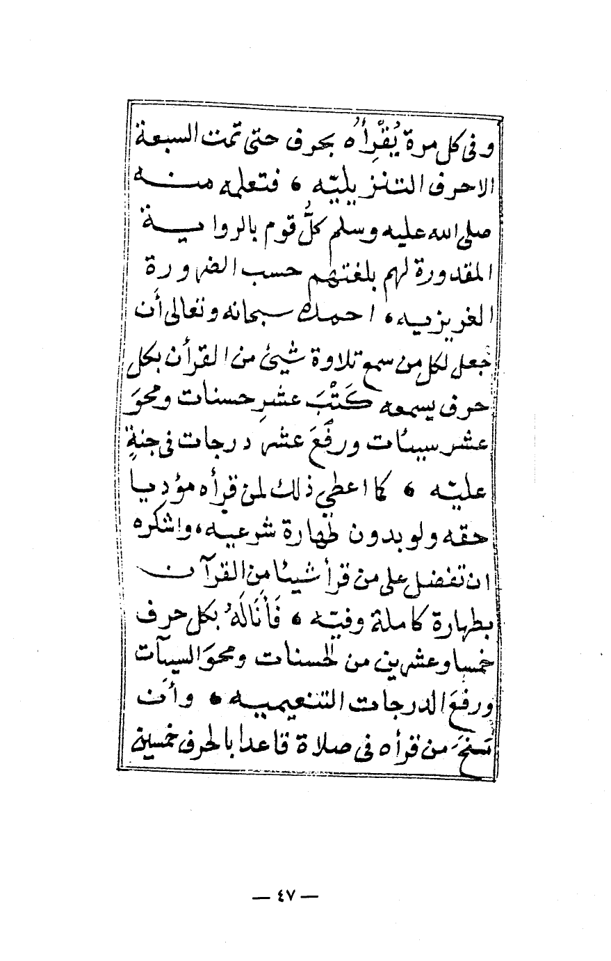وفي كل مرة يقرأه بحرف حتى تمت السبعة الأحرف التنزيلية، فتعلمه منه صلى الله عليه وسلم كلُ قوم بالرواية المقدورة لهم بلغتهم حسب الضرورة الغريزية، أحمده سبحانه وتعالى أن جعل لكل من سمع تلاوة شيء من القرآن بكل حرف يسمعه كتبَ عشرِ حسنات ومحوَ عشر سيئات ورفع عشر درجات في جنةٍ عليّه، كما أعطي ذلك لمن قرأه مؤدياً حقه ولو بدون طهارة شرعية، وأشكره أن تفضل على من قرأ شيئاً من القرآن بطهارة كاملة وفية، فأناله بكل حرف خمساً وعشرين من الحسنات ومحوَ السيئات ورفع الدرجات التنعيمية، وأن منح من قرأه في صلاة قاعداً بالحرف خسمين ...