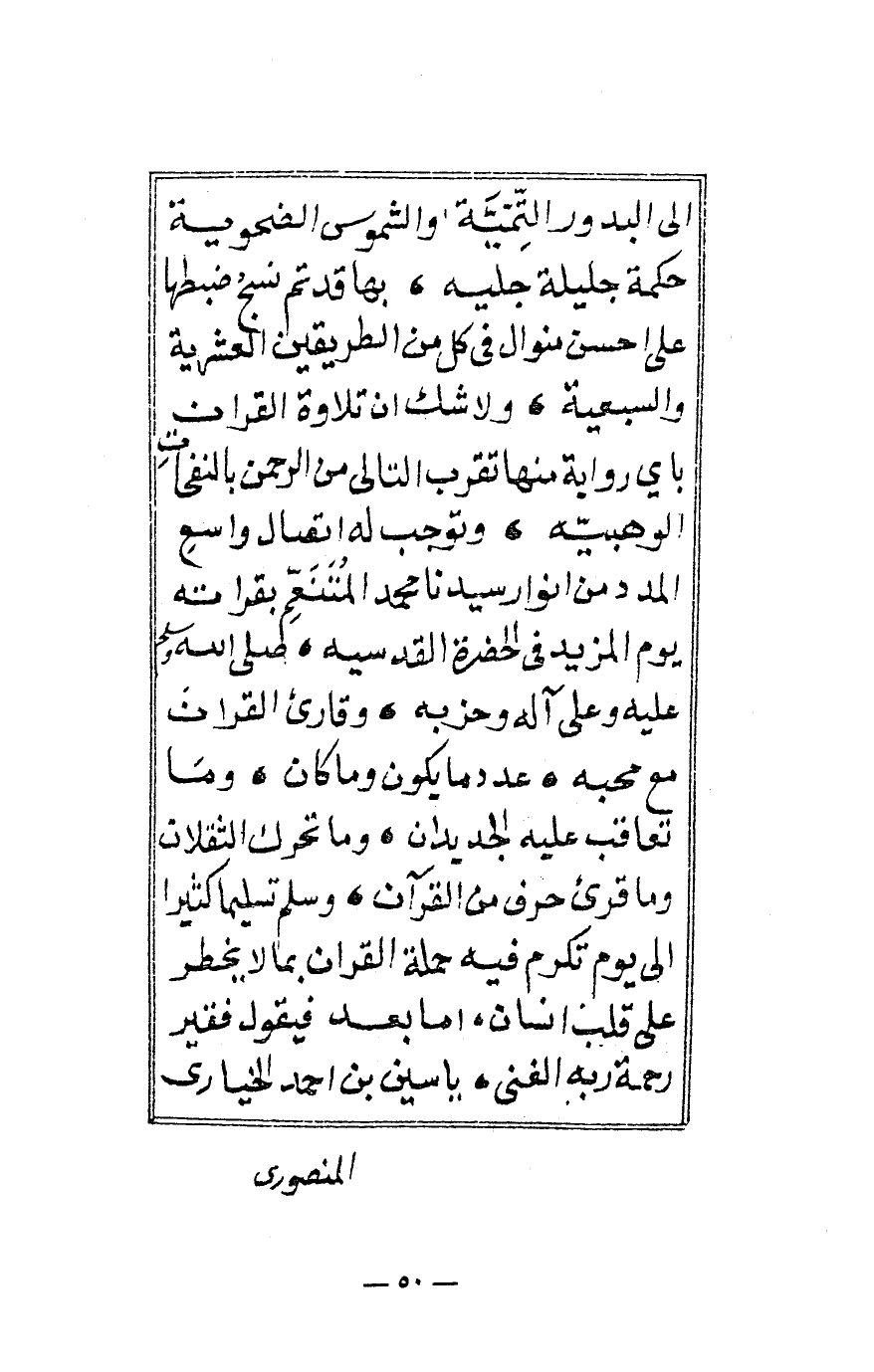 إلى البدور التمية، والشموس الضحوية حكمة جليلة جلية، بها قد تم نسج ضبطها على أحسن منوال في كل من الطريقين العشرية والسبعية، ولا شك أن تلاوة القرآن بأي رواية منها تقرب التالي من الرحمن بالنفحات الوهبية، وتوجب له اتصال واسع المدد من أنوار سيدنا محمد المتنعم بقراآته يوم المزيد في الحضرة القدسية، صلى الله وسلم عليه وعلى آله وحزبه، وقارئ القرآن مع محبه، عدد ما يكون وما كان، وما تعاقب عليه الجديدان، وما تحرك الثقلان وما قرئ حرف من القرآن، وسلم تسليماً كثيراً إلى يوم تكرم فيه حملة القرآن بما لا يخطر على قلب إنسان، أما بعد فيقول فقير رحمة ربه الغني، ياسين بن أحمد الخياري ...