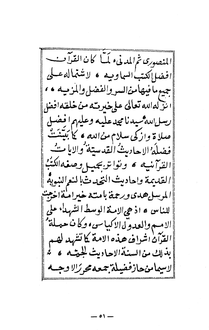 المنصوري ثم المدني، لما كان القرآن أفضل الكتب السماوية لاشتماله على جميع ما فيها من السر والفضل والمزية،، أنزله الله تعالى على خيرته من خلقه أفضل رسل الله سيدنا محمد عليه وعليهم أفضل صلاة وأزكى سلام من الله، كما بينت فضله الأحاديث القدسية والآيات القرآنية، وتواترت بجميل وصفه الكتب القديمة وأحاديث التحدث بالنعم النبوية، المرسل هدى ورحمة أمته خير أمة أخرجت للناس، إذ هي الأمة الوسط الشهداء على الأمم والعدول الأكياس، وكان حملة القرآن أشراف هذه الأمة كما تشهد لهم بذلك من السنة الأحاديث الجمة، لاسيما من حاز فضيلة جمعه محرر الأوجه