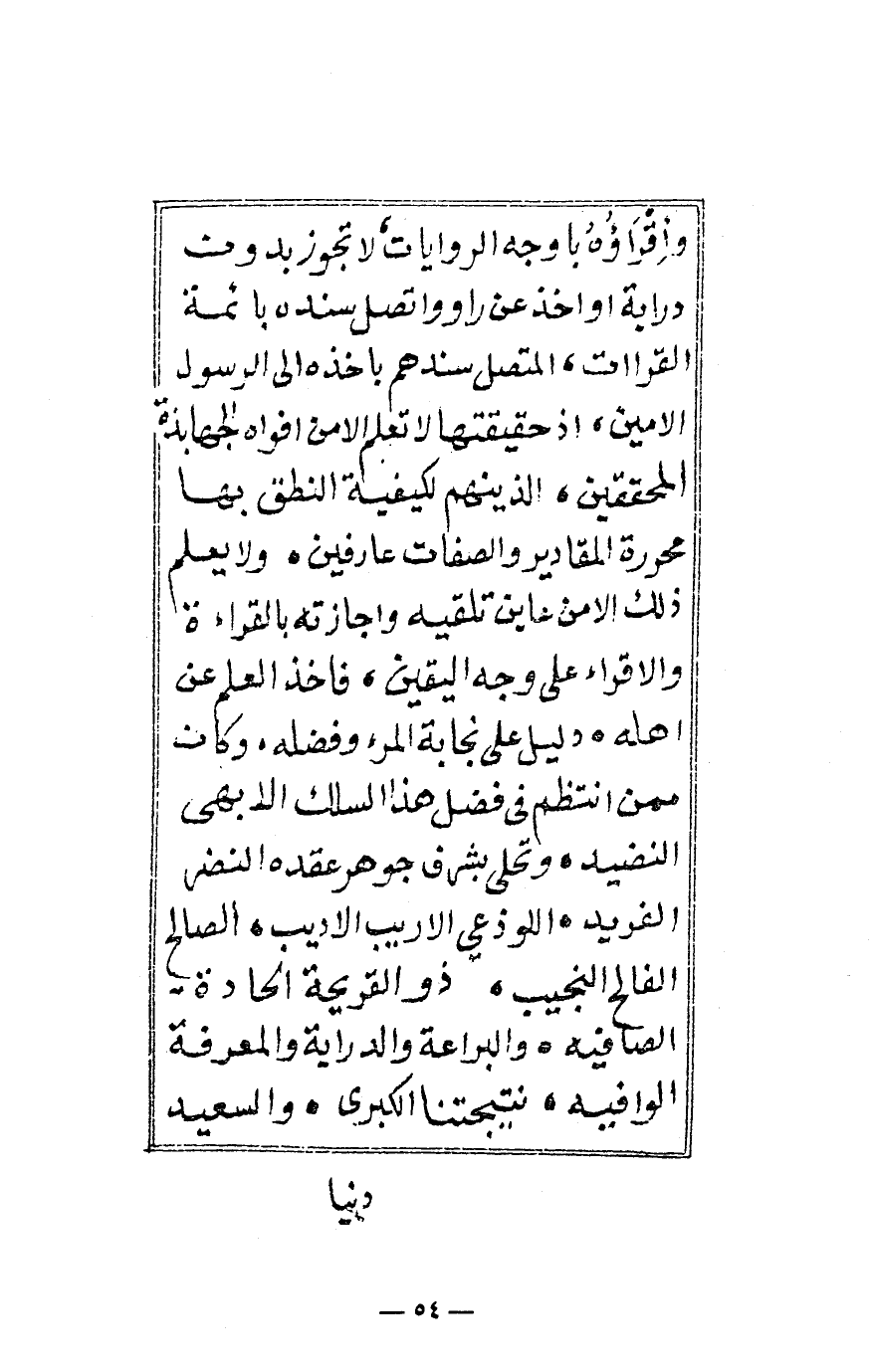 وإقراؤه بأوجه الروايات، لا تجوز بدون دراية أو أخذ عن راوٍ واتصل سنده بأئمة القراآت، المتصل سندهم بأخذه إلى الرسول الأمين، إذ حقيقتها لا تعلم إلا من أفواه الجهابذة المحققين، الذين هم لكيفية النطق بها محررة المقادير والصفات عارفين، ولا يعلم ذلك إلا من عاين تلقيه وإجازته بالقراءة والإقراء على وجه اليقين، فأخذ العلم عن أهله ودليل على نجابة المرء وفضله، وكان ممن انتظم في فضل هذا السلك الأبهى النضيد، وتحلى بشرف جوهر عقده النضر الفريد، اللوذعي الأريب الأديب، الصالح الفالح النجيب، ذو القريحة الحادة، الصافية. والبراعة والدراية والمعرفة الوافية، نتيجتنا الكبرى والسعيد ...