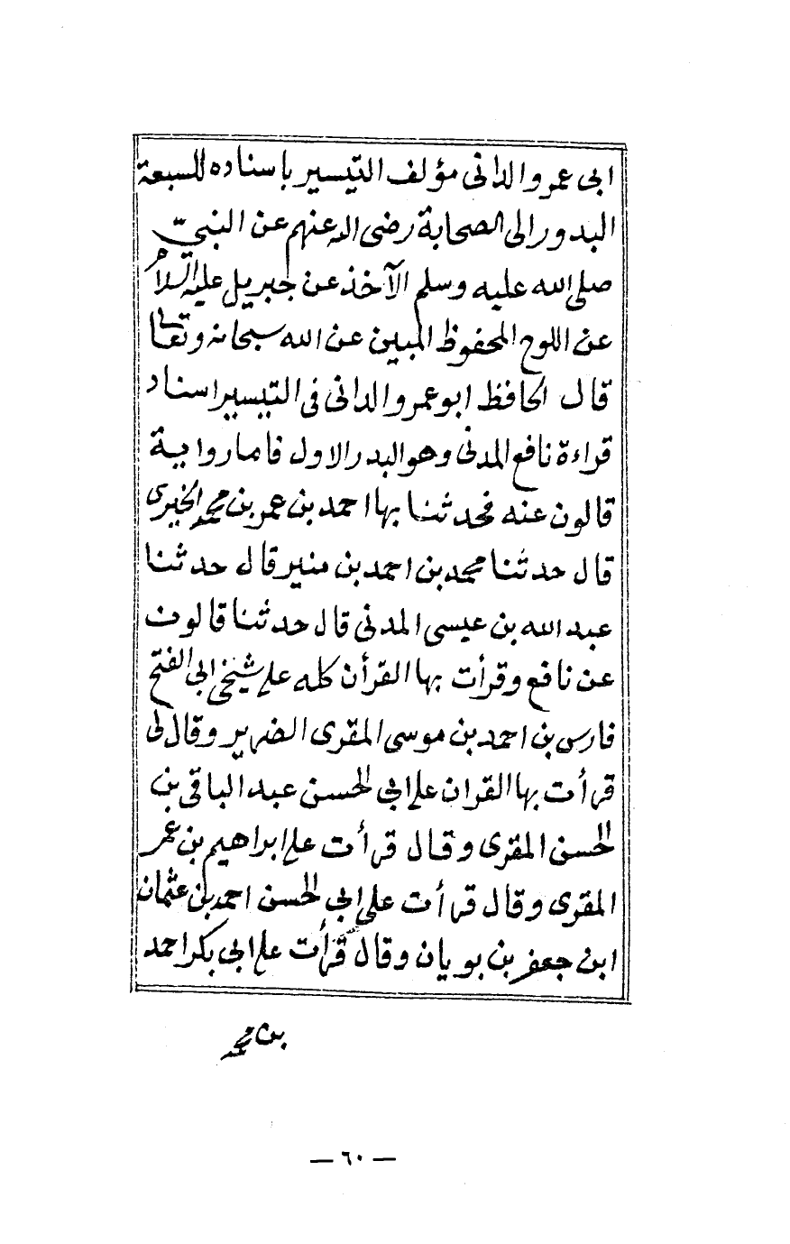 أبي عمرو الداني مؤلف التيسير بإسناده للسبعة البدور إلى الصحابة رضي الله عنهم عن النبي صلى الله عليه وسلم الآخذ عن جبريل عليه السلام عن اللوح المحفوظ المبين عن الله سبحانه وتعالى قال الحافظ أبو عمرو الداني في التيسير إسناد قراءة نافع المدني وهو البدر الأول فأما رواية قالون عنه فحدثنا بها أحمد بن عمر بن محمد الخيري قال حدثنا محمد بن أحمد بن منير قال حدثنا عبد الله بن عيسى المدني قال حدثنا قالون عن نافع وقرأت بها القرآن كله على شيخي أبي الفتح فارس بن أحمد بن موسى المقرئ الضرير وقال لي قرأت بها القرآن على أبي الحسن عبد الباقي بن الحسن المقرئ وقال قرأت على إبراهيم بن عمر المقري وقال قرأت على أبي الحسن أحمد بن عثمان ابن جعفر بن بويان وقال قرأت على أبي بكر أحمد ...