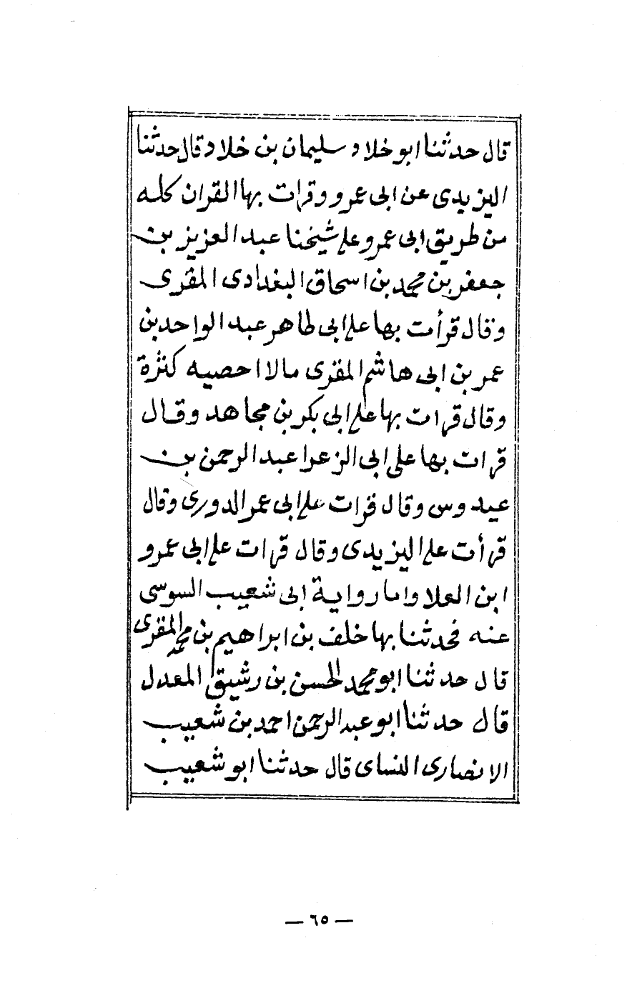 قال حدثنا أبو خلاد سليمان بن خلاد قال حدثنا اليزيدي عن أبي عمرو وقرأت بها القرآن كله من طريق أبي عمرو على شيخنا عبد العزيز بن جعفر بن محمد بن إسحاق البغدادي المقري وقال قرأت بها على أبي طاهر عبد الواحد بن عمر بن أبي هاشم المقري مالا أحصيه كثرة وقال قرأت بها على أبي بكر بن مجاهد وقال قرأت بها على أبي الزعرا عبد الرحمن بن عيدوس وقال قرأت على أبي عمر الدوري وقال قرأت على اليزيدي وقال قرأت على أبي عمرو ابن العلا وأما رواية أبي شعيب السوسي عنه فحدثنا بها خلف بن إبراهيم بن محمد المقري قال حدثنا أبو محمد الحسن بن رشيق المعدل قال حدثنا أبو عبد الرحمن أحمد بن شعيب الأنصاري النساي قال حدثنا أبو شعيب ...