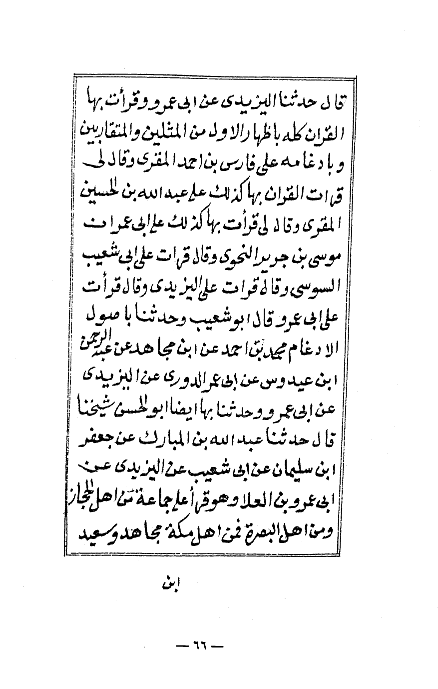قال حدثنا اليزيدي عن أبي عمرو وقرأت بها القرآن كله بإظهار الأول من المثلين والمتقاربين وبإدغامه على فارس بن أحمد المقري وقال لي قرأت القرآن بها كذلك على عبد الله بن الحسين المقري وقال لي قرأت بها كذلك على أبي عمران موسى بن جرير النحوي وقال قرأت على أبي شعيب السوسي وقال قرأت على اليزيدي وقال قرأت على أبي عمرو قال أبو شعيب وحدثنا بأصول الإدغام محمد بن أحمد عن ابن مجاهد عن عبد الرحمن ابن عيدوس عن أبي عمر الدوري عن اليزيدي عن أبي عمرو وحدثنا بها أيضاً أبو الحسن شيخنا قال حدثنا عبد الله بن المبارك عن جعفر ابن سليمان عن أبي شعيب عن اليزيدي عن ابن عمرو بن العلا وهو قرأ على جماعة من أهل الحجاز ومن أهل البصرة فمن أهل مكة مجاهد وسعيد ...