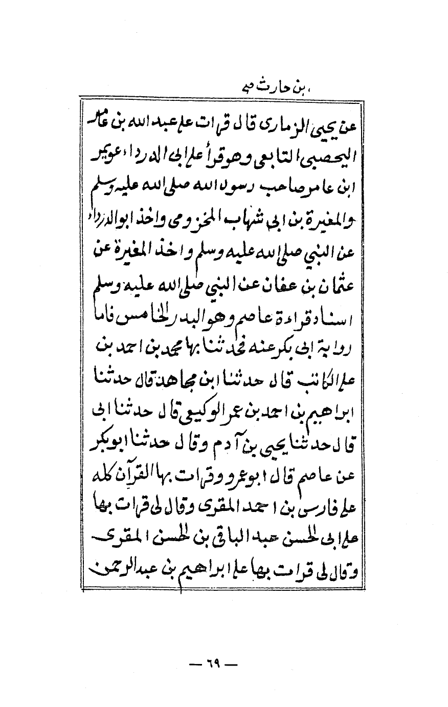 عن يحيى الزماري قال قرأت على عبد الله بن عامر اليحصبي التابعي وهو قرأ على أبي الدرداء عويمر ابن عامر صاحب رسول الله صلى الله عليه وسلم والمغيرة بن أبي شهاب المخزومي وأخذ أبو الدرداء عن النبي صلى الله عليه وسلم وأخذ المغيرة عن عثمان بن عفان عن النبي صلى الله عليه وسلم إسناد قراءة عاصم وهو البدر الخامس فأما رواية أبي بكر عنه فحدثنا بها محمد بن أحمد بن علي الكاتب قال حدثنا ابن مجاهد قال حدثنا إبراهيم بن أحمد بن عمر الوكيعي قال حدثنا أبي قال حدثنا يحيى بن آدم وقال حدثنا أبو بكر عن عاصم قال أبو عمرو وقرأت بها القرآن كله على فارس بن أحمد المقري وقال لي قرأت بها على أبي الحسن عبد الباقي بن الحسن المقري وقال لي قرأت بها على إبراهيم بن عبد الرحمن ...
