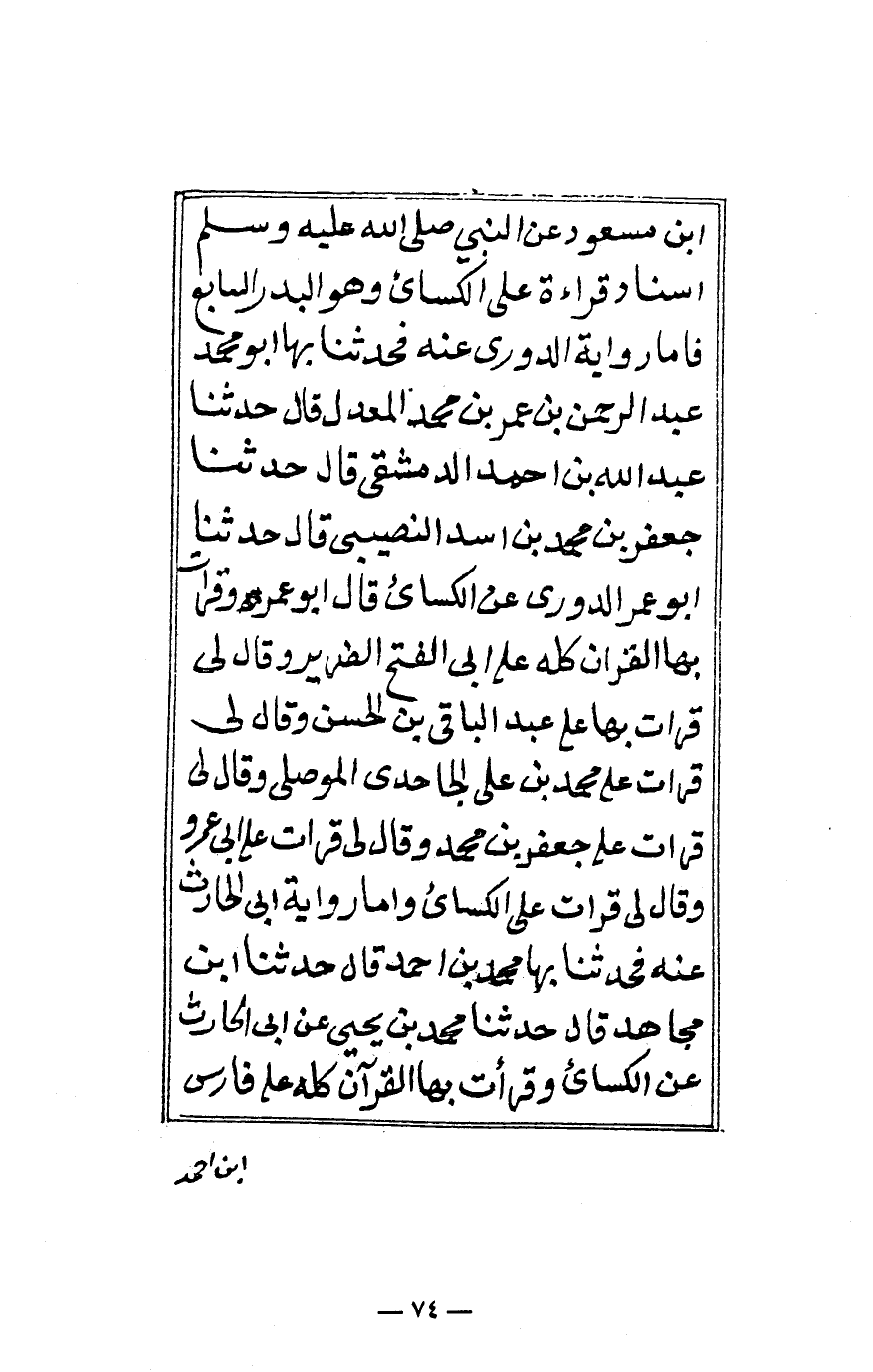 ابن مسعود عن النبي صلى الله عليه وسلم إسناد قراءة على الكسائي وهو البدر السابع فأما رواية الدوري عنه فحدثنا بها أبو محمد عبد الرحمن بن عمر بن محمد المعدل قال حدثنا عبد الله بن أحمد الدمشقي قال حدثنا جعفر بن محمد بن أسد النصيبي قال حدثنا أبو عمر الدوري عن الكسائي قال أبو عمر وقرأت بها القرآن كله على أبي الفتح الضرير وقال لي قرأت بها على عبد الباقي بن الحسن وقال لي قرأت على محمد بن علي الجاحدي الموصلي وقال لي قرأت على جعفر بن محمد وقال لي قرأت على أبي عمرو وقال لي قرأت على الكسائي وأما رواية أبي الحارث عنه فحدثنا بها محمد بن أحمد قال حدثنا ابن مجاهد قال حدثنا محمد بن يحيى عن أبي الحارث عن الكسائي وقرأت بها القرآن كله على فارس ...