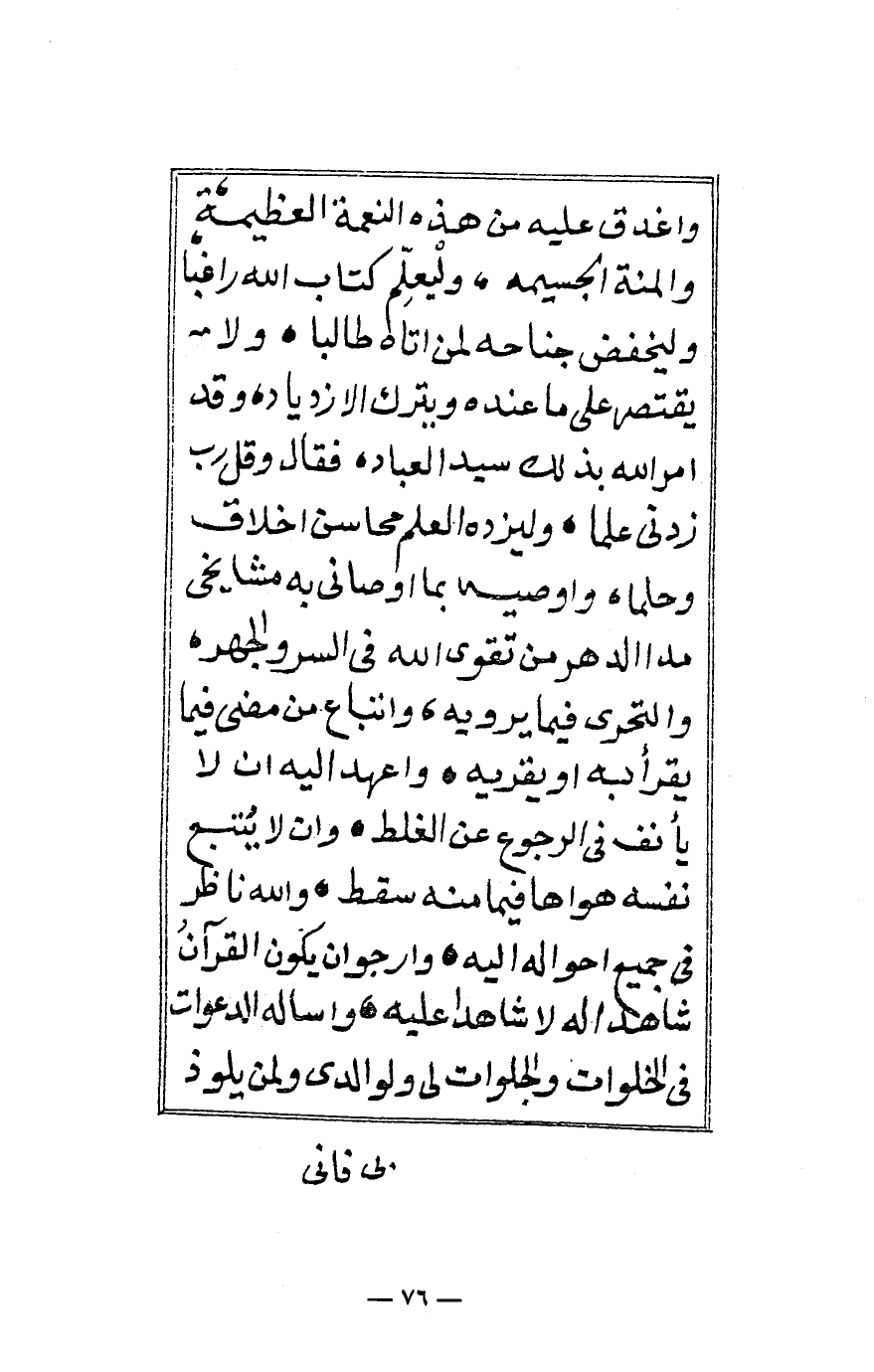 وأغدق عليه من هذه النعمة العظيمة والمنة الجسيمة، وليعلم كتاب الله راغباً وليخفض جناحه لمن أتاه طالباً. ولا - يقتصر على ما عنده ويترك الازدياد، وقد أمر الله بذلك سيد العباد، فقال وقل رب زدني علما، وليزده العلم محاسن أخلاق وحلماً، وأوصيه بما أوصاني به مشايخي مد الدهر من تقوى الله في السر والجهر، والتحري فيما يرويه، واتباع من مضى فيما يقرأ به أو يقريه، وأعهد إليه أن لا يأنف في الرجوع عن الغلط، وأن لا يتبع نفسه هواها فيما منه سقط، والله ناظر في جميع أحواله إليه، وأرجو أن يكون القرآن شاهداً له لا شاهداً عليه، وأسأله الدعوات في الخلوات والجلوات لي ولوالدي ولمن يلوذ ...