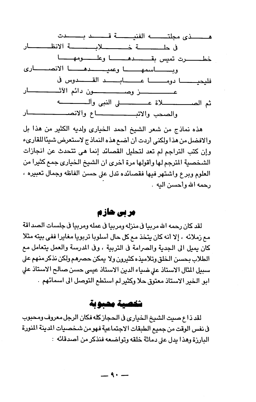 هذه نماذج من شعر الشيخ أحمد الخياري ولديه الكثير من هذا بل والأفضل من هذا ولكني أردت أن أضع هذه النماذج لاستعرض شيئاً للقارئ وإن كتب التراجم لم تعد لتحليل القصائد إنما هي تتحدث عن إنجازات الشخصية المترجم لها وأقولها مرة أخرى أن الشيخ الخياري جمع كثيراً من العلوم وبرع واشتهر فيها فقصائده تدل على حسن ألفاظه وجمال تعبيره. رحمه الله وأحسن إليه.