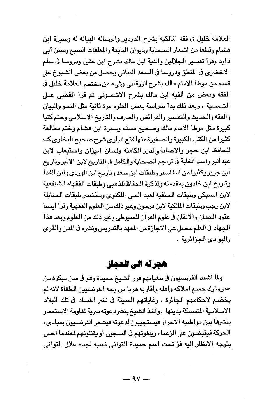 العلامة خليل في فقه المالكية بشرح الدردير والرسالة البيانة له وسيرة ابن هشام وقطعاً من أشعار الصحابة وديوان النابغة والمعلقات السبع وسنن أبي داود وقرأ تفسير الجلالين وألفية ابن مالك بشرح ابن عقيل ودروساً في سلم الأخضري في المنطق ودروساً في السعد البياني وحصل من بعض الشيوخ على قسم من موطأ الإمام مالك بشرح الزرقاني وشيء من مختصر العلامة خليل في الفقه وبعض من ألفية ابن مالك بشرح الأشموني ثم قرأ القطبي على الشمسية، وبعد ذلك بدا بدراسة بعض العلوم مرة ثانية مثل النحو والبيان والفقه والحديث والتفسير والفرائض والصرف والتاريخ الإسلامي وختم كتباً كبيرة مثل موطأ الإمام مالك وصحيح مسلم وسيرة ابن هشام وختم مطالعة كثيراً من الكتب الكبيرة والصغيرة منها فتح الباري شرح صحيح البخاري كله للحافظ ابن حجر والإصابة والدرر الكامنة ولسان الميزان واستيعاب لابن عبد البر وأسد الغابة في تراجم الصحابة والكامل في التاريخ لابن الأثير وتاريخ ابن جرير وكثيراً من التفاسير وطبقات ابن سعد وتاريخ ابن الوردي وابن الفدا وتاريخ ابن خلدون بمقدمته وتذكرة الحفاظ للذهبي وطبقات الفقهاء الشافعية لابن رجب وطبقات المالكية لابن فرحون وغير ذلك من العلوم الفقهية وقرأ أيضاً عقود الجمان والإتقان في علوم القرآن للسيوطي وغير ذلك من العلوم وبعد هذا الجهاد في العلم حصل على الإجازة من المعهد بالتدريس ونشره في المدن والقرى والبوادي الجزائرية.