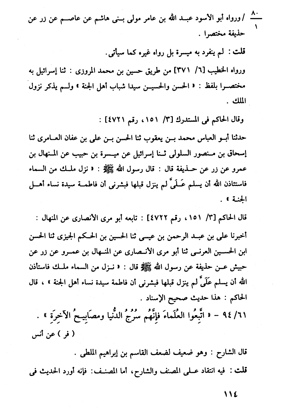 أخبرنا على بن عبد الرحمن بن عيسى ثنا الحسين بن الحكم الجيزى ثنا الحسن ابن الحسين العرنى ثنا أبو مرى الأنصارى عن المنهال بن عمرو عن زر عن حبيش عن حذيفة عن رسول اللَّه -صلى اللَّه عليه وسلم- قال: "نزل من السماء ملك فاستأذن اللَّه أن يسلم عَلَيَّ لم ينزل قبلها فبشرنى أن فاطمة سيدة نساء أهل الجنة"، قال الحاكم: هذا حديث صحيح الإسناد.