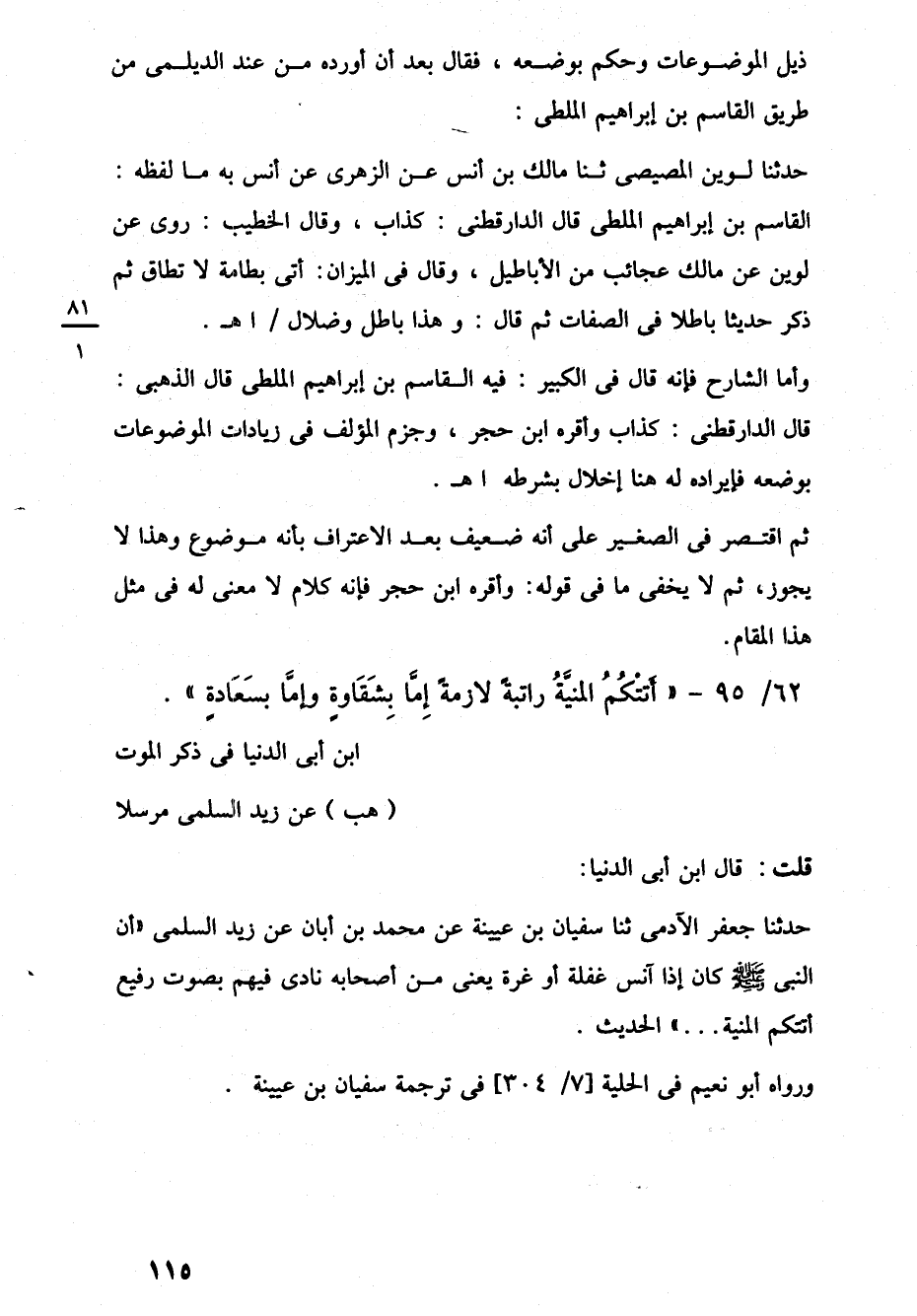 حدثنا لوين المصيصى ثنا مالك بن أنس عن الزهرى عن أنس به ما لفظه: القاسم بن إبراهيم الملطى قال الدارقطنى: كذاب، وقال الخطيب: روى عن لوين عن مالك عجائب من الأباطيل، وقال في الميزان: أتى بطامة لا تطاق ثم ذكر حديثا باطلا في الصفات ثم قال: وهذا باطل وضلال اهـ.